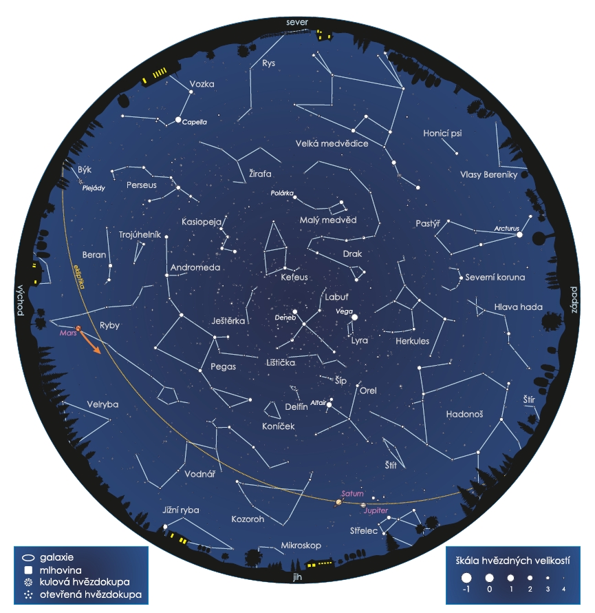 Kruhová mapa zobrazuje podobu nočního nebe 15. října 2020 ve 20:00 středoevropského letního času (SELČ). Na počátku měsíce platí pro 21:00 SELČ, na jeho konci pro 18:00 SEČ (středoevropský čas).