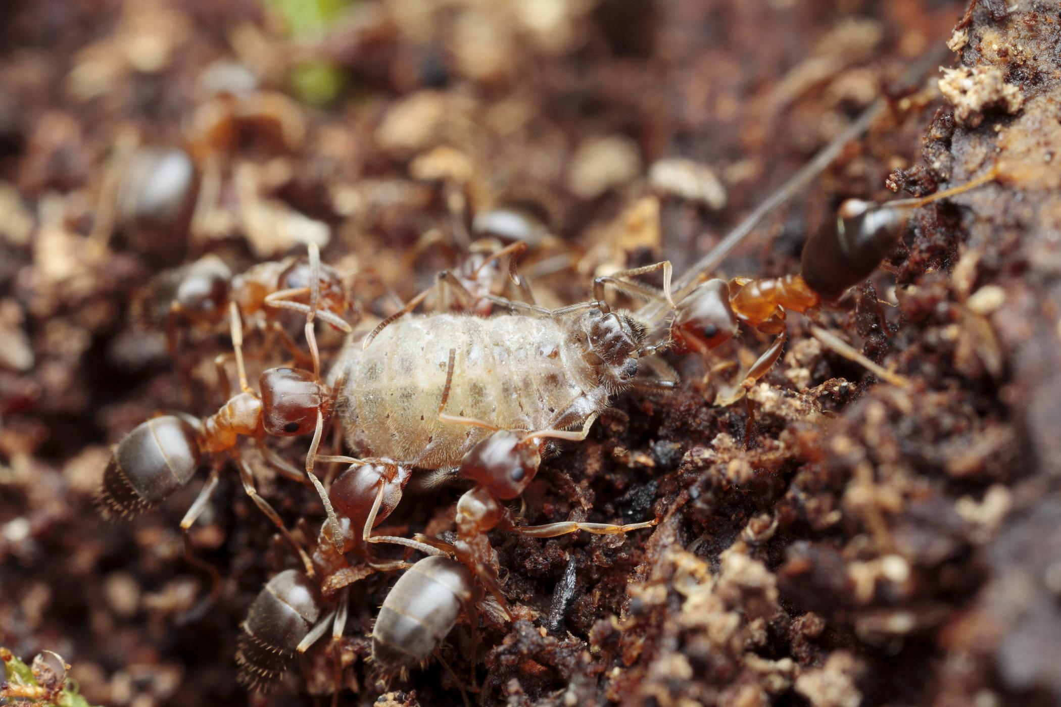 Na tomto snímku je zřetelně vidět medovice, kterou mšice platí mravencům za ochranu.