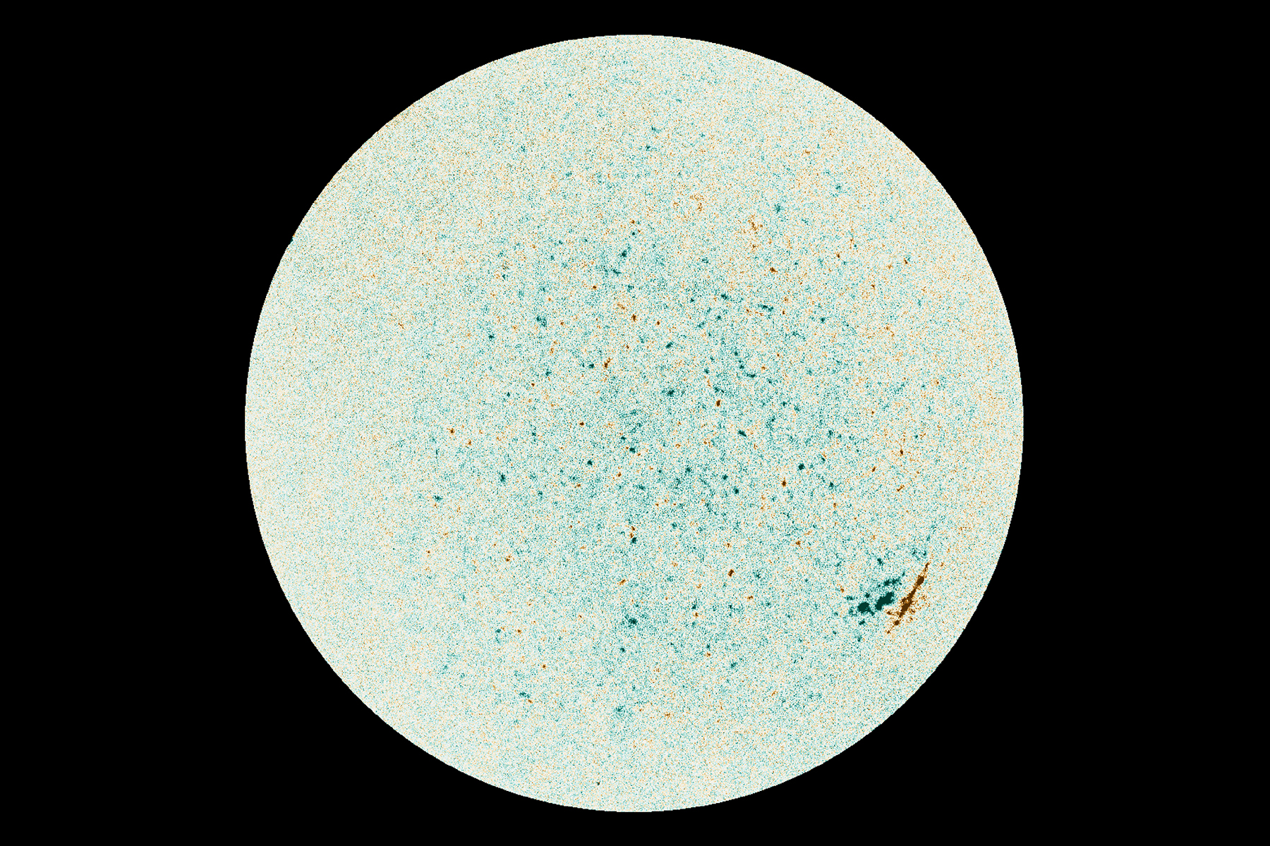 Mapa magnetického pole pro celé Slunce na základě dat z Polarimetric and Helioseismic Imager (PHI). V pravém dolním kvadrantu je vidět velká magneticky aktivní oblast.