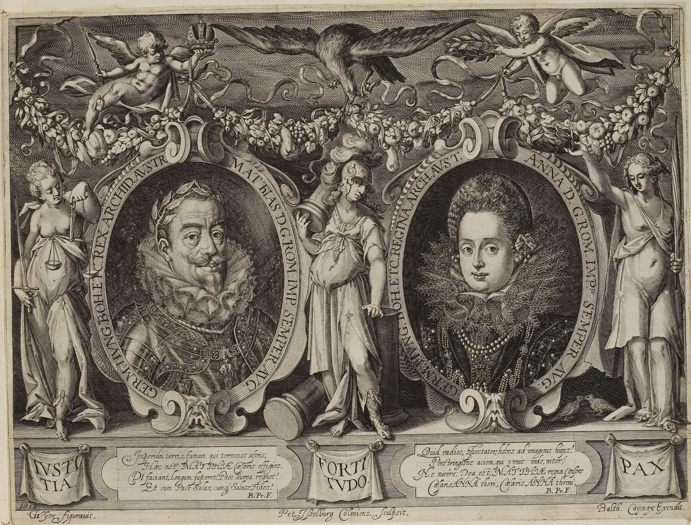 Anna Tyrolská s manželem císařem Matyášem. Vezhledem k tomu, že jejich manželství bylo bezdětné, bylo následnictví na základě tzv. Oňatovy smlouvy určeno Ferdinandovi II. ze štýrské větve Habsburků.