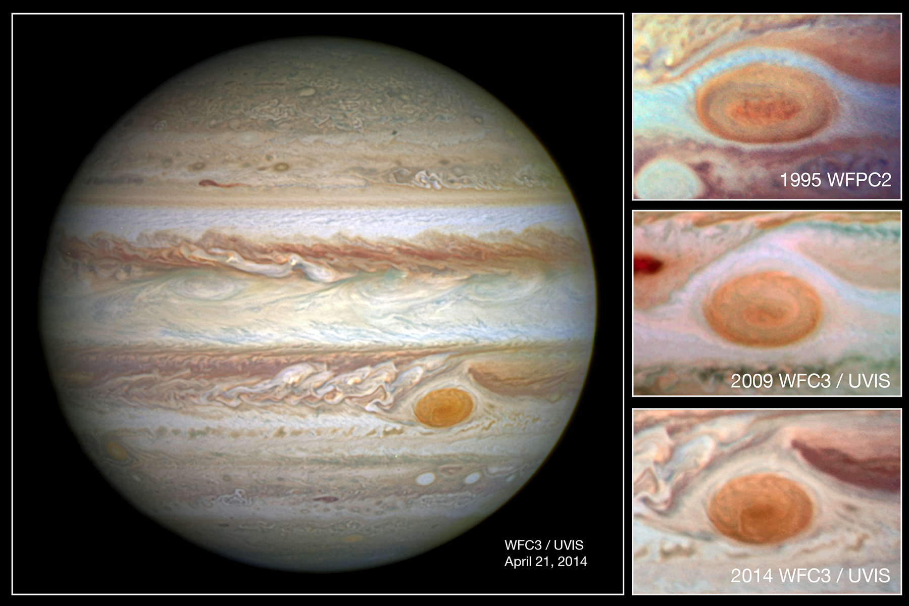 Snímky Velké rudé skvrny, jak je pořídil Hubbleův teleskop. Zatímco v roce 1995 měřila v průměru necelých 21 tisíc kilometrů, o 19 let později to bylo již jen necelých 16 tisíc kilometrů.