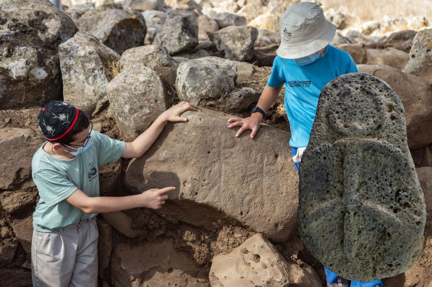 Místní školáci ukazují nalezené reliéfy, podle archeologů by mohlo jít o mezopotámského měsíčního boha. Vpravo podobná postava s rohy z nedalekého et-Tellu na Golanských výšinách.
