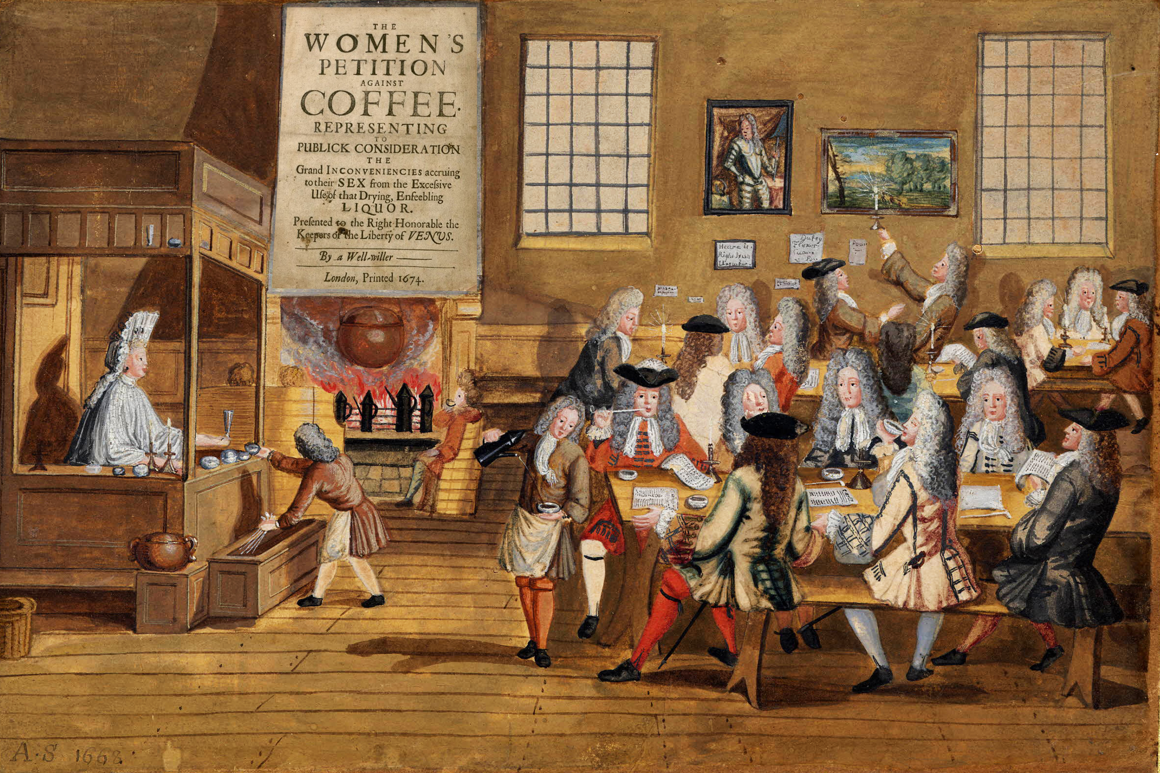 Interiér londýnské kavárny na přelomu 18. a 19. století. Ženská petice proti pití kávy vylíčila kafaře jako neschopné impotenty.