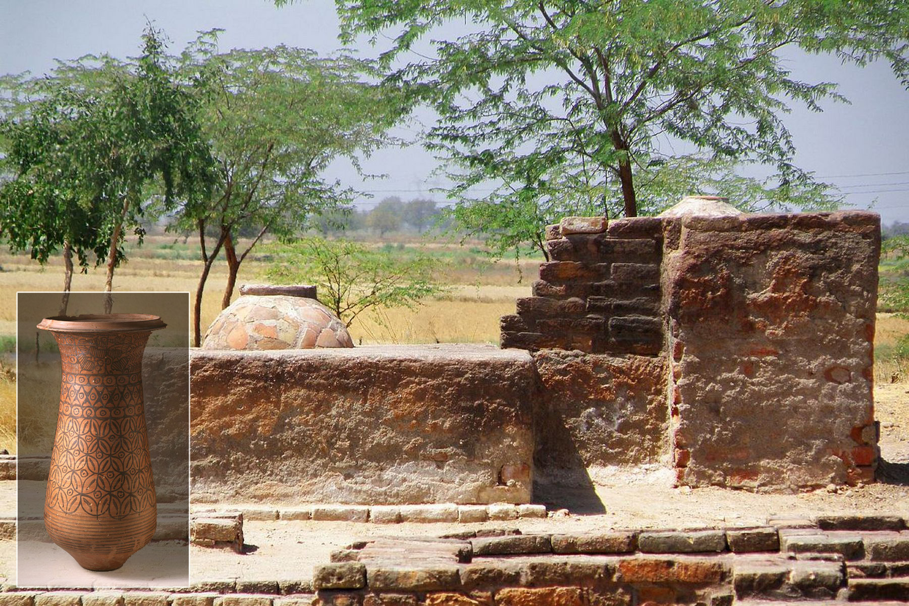 Pozůstatky koupelen v Lóthalu - jednoho z nejvýznamnějších měst harappské kultury. Ve výřezu harappská obřadní nádoba z doby 2600–2450 př. n. l.