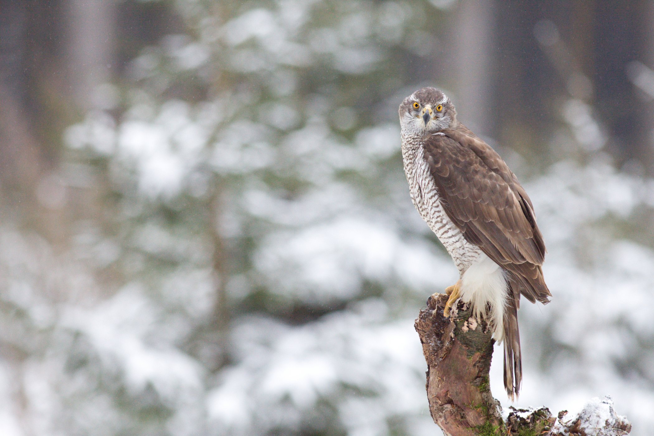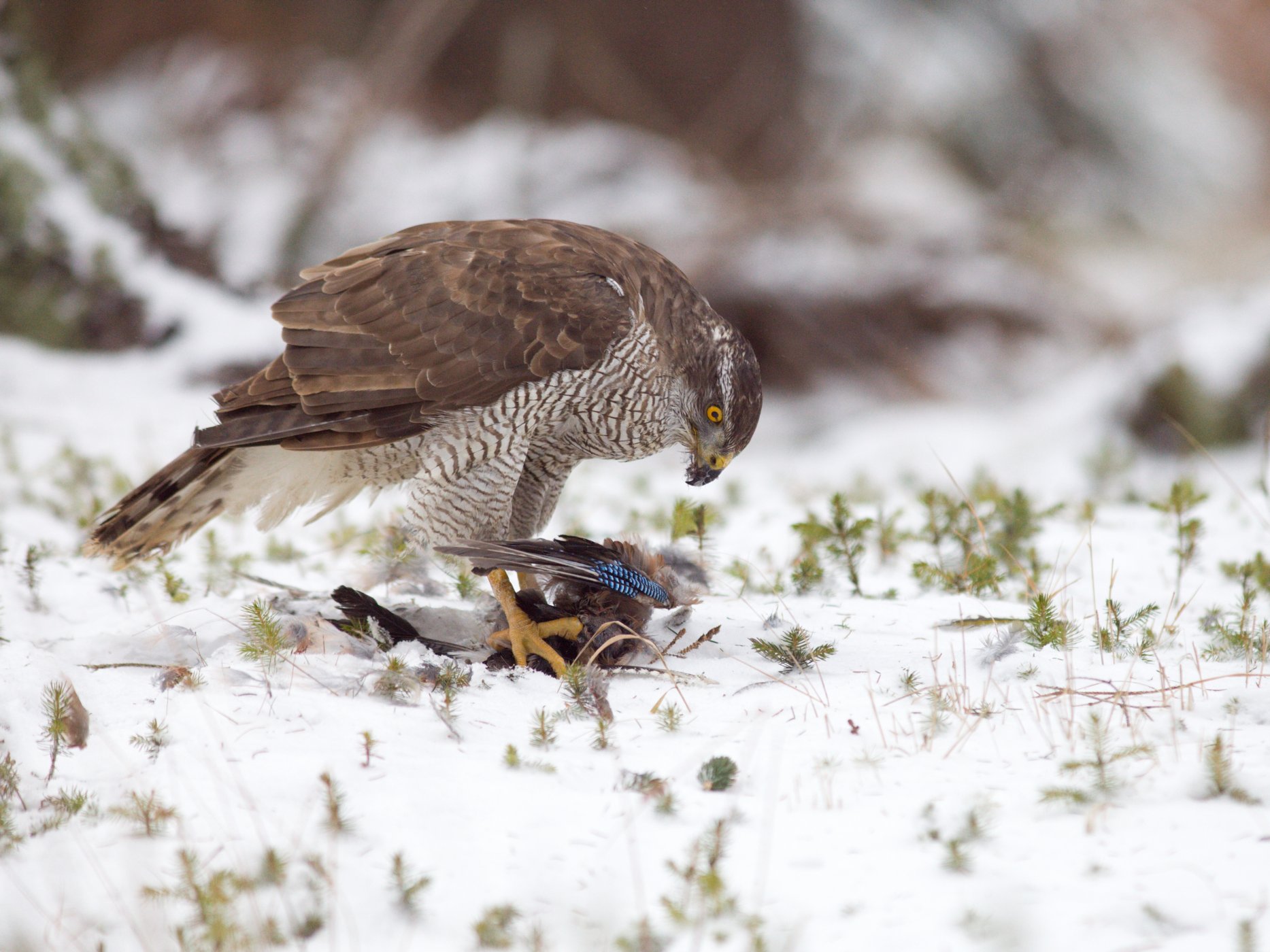 Jestřáb v přírodě plní nezastupitelnou úlohu zdravotní policie. Na snímku s ulovenou sojkou