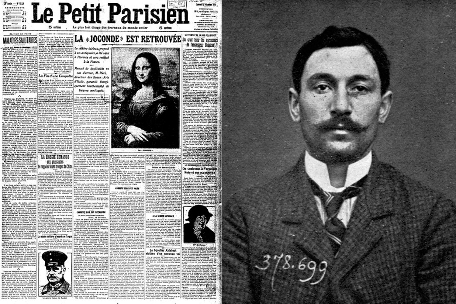 Noviny s článkem o nalezení obrazu Mony Lisy a zloděj, který obraz ukradl - Vincenzo Peruggia. (foto: Wikimedia Commons)