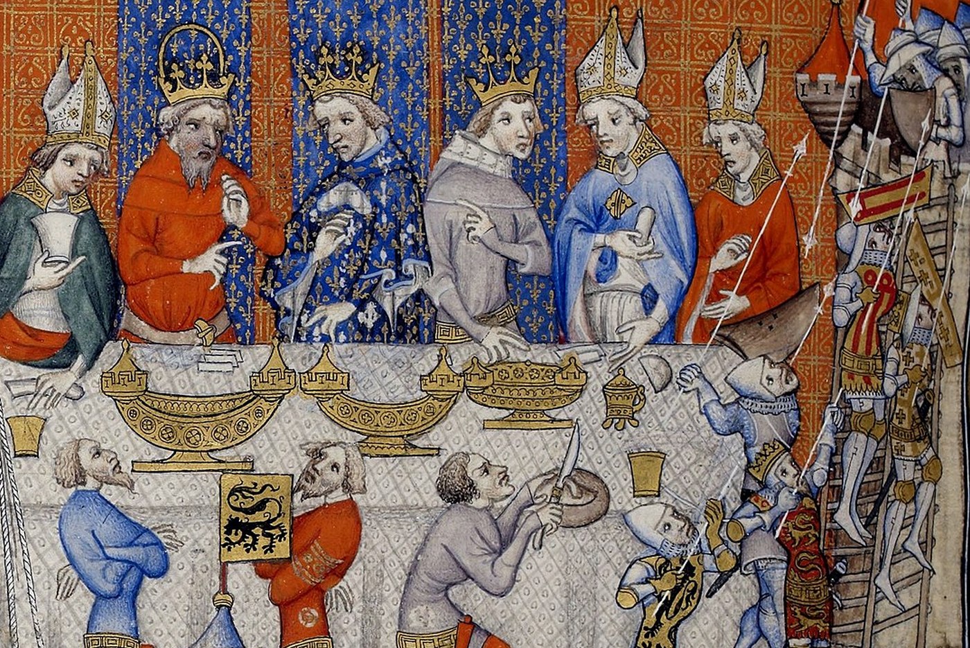 Banket na francouzském dvoře, kde roku 1378 francouzský král Karel V. (uprostřed v modrém) hostil císaře Karla IV. (vlevo v červeném) a jeho syna Václava IV. (vpravo).