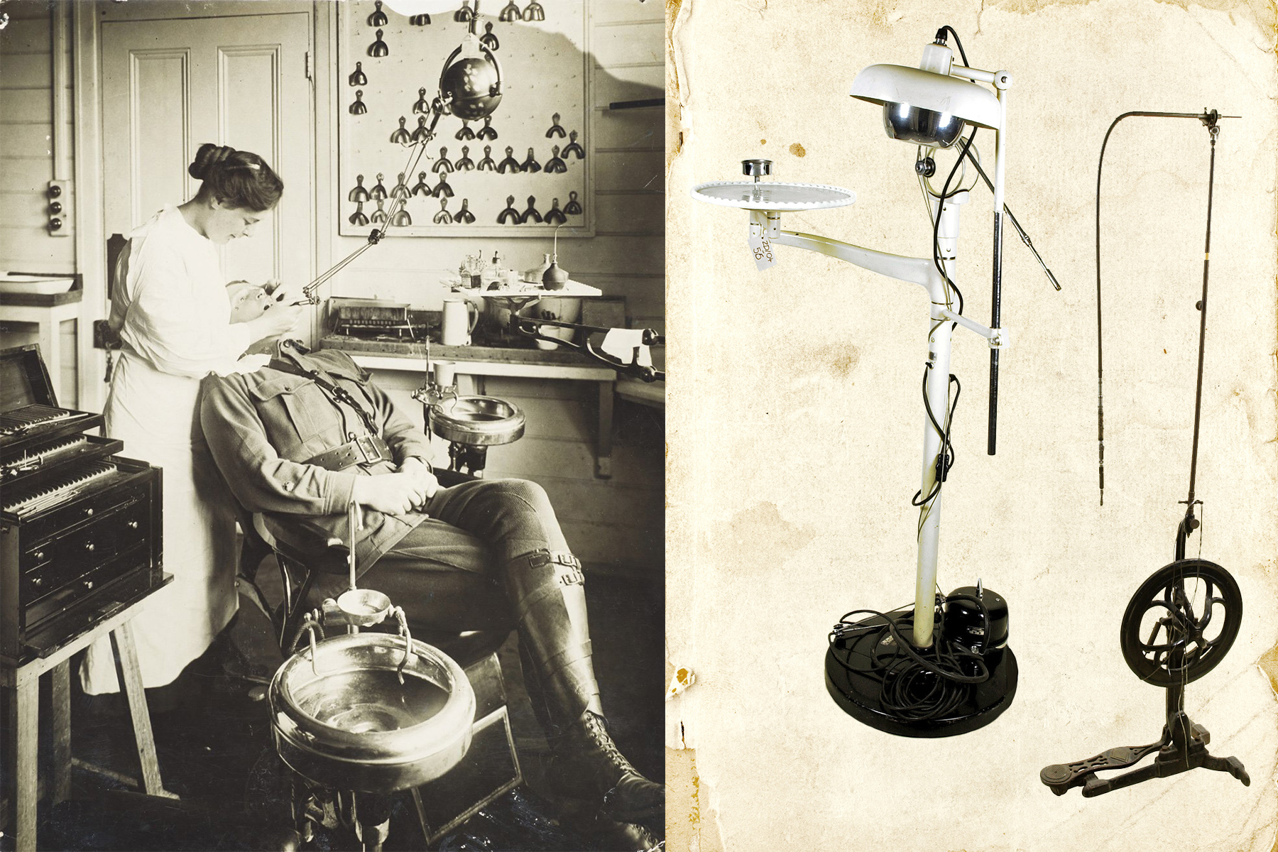 První zubní vrtačky na šlapací pohon připomínaly šicí stroje (zcela vpravo), elektrické modely přišly až ve třicátých letech, sbírky Východočeského muzea v Hradci Králové. Vlevo Dr. Fannie Grayová, první žena-zubařka v Austrálii (1914).