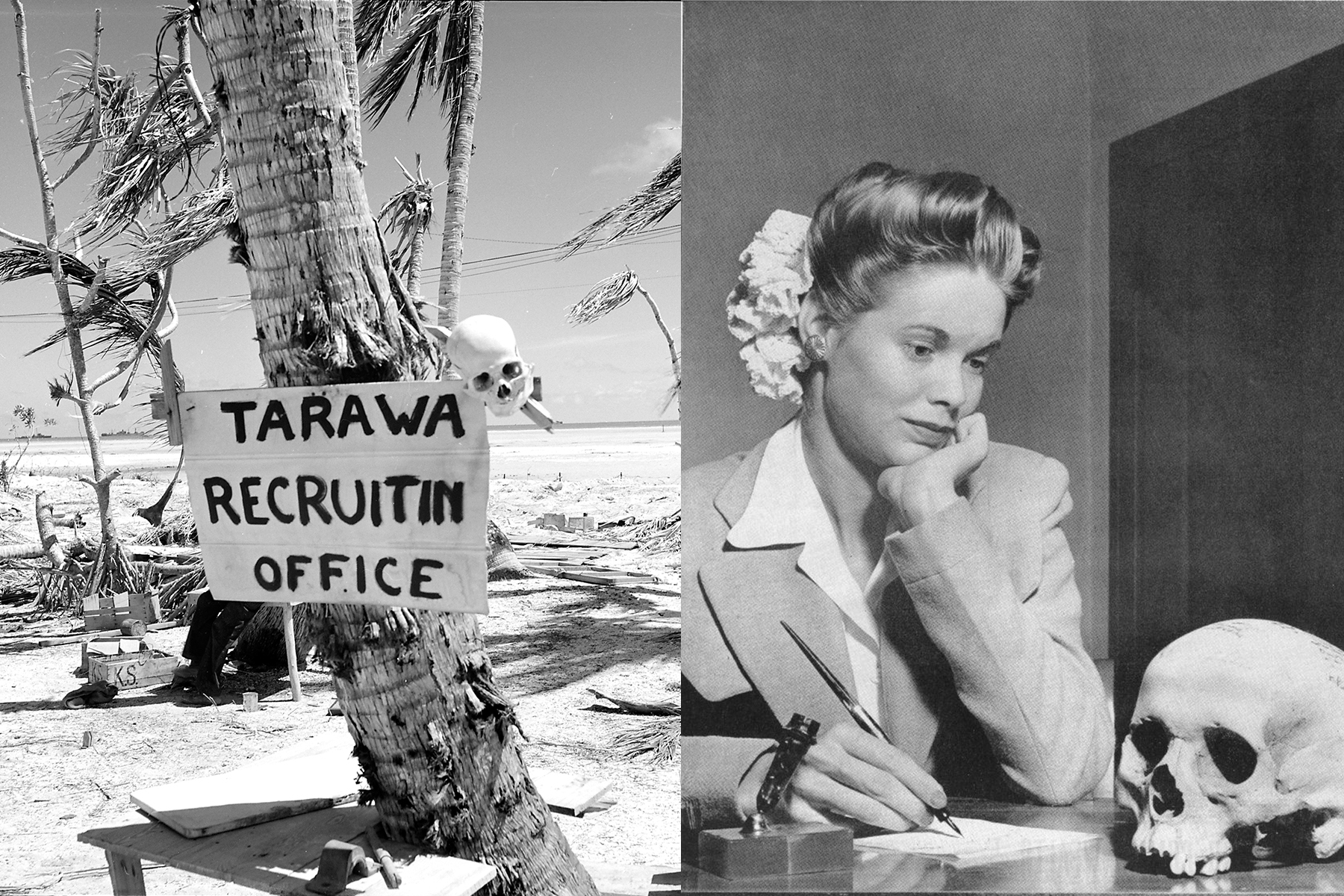 Vpravo fotografie z časopisu Life z května 1944. Americká dívka píše dopis svému chlapci a děkuje mu v něm za zaslání lebky japonského vojáka coby válečné trofeje. Vlevo šibeniční humor amerických vojáků: „odvodní kancelář na Tarawě“.