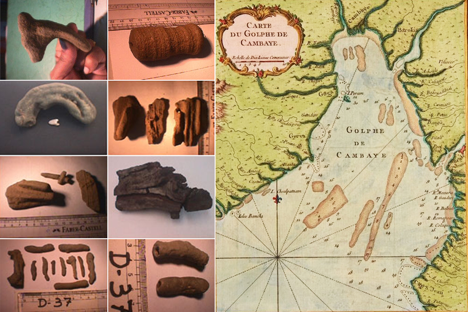 Některé z nalezených předmětů a Khambhátský záliv na mapě z 18. století.
