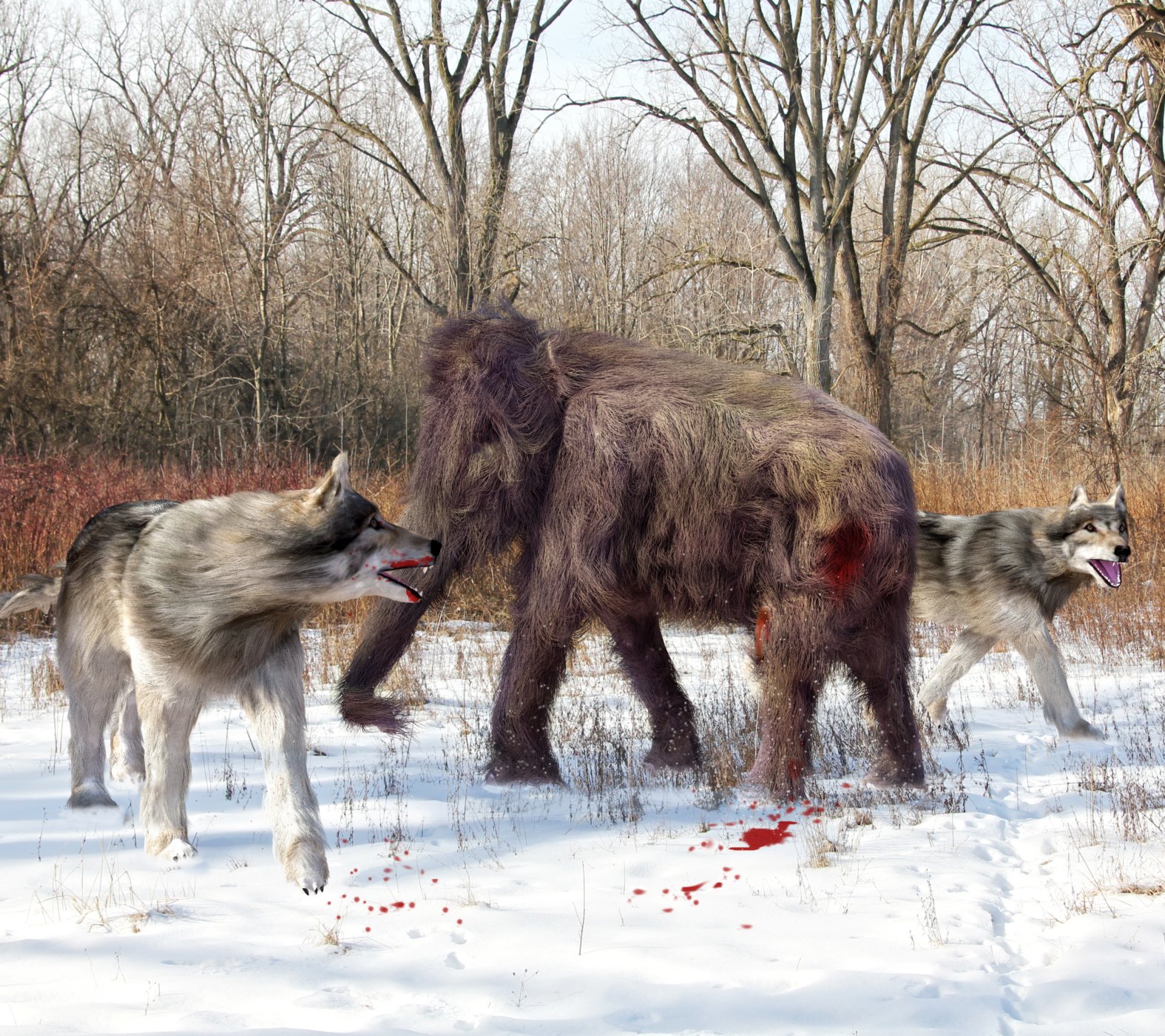 Ilustrace mamutího mláděte atakovaného dvojicí pravlků. Dospělí jedinci dávno vyhynulých pravlků byli asi o 30 % větší než dnešní vlci.