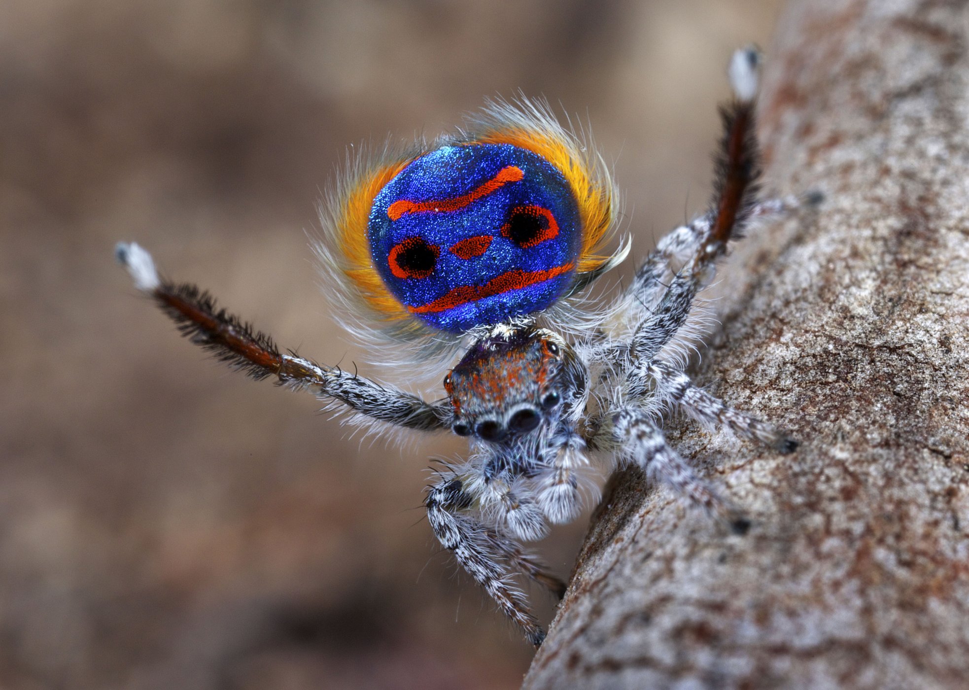 Skákavkovitý pavouček druhu Maratus speciosus má na svém rozvinutém zadečku kresbu, která velmi připomíná obličej. Můžete vidět oči, nos, ústa a dokonce i obočí. (foto: Shutterstock)