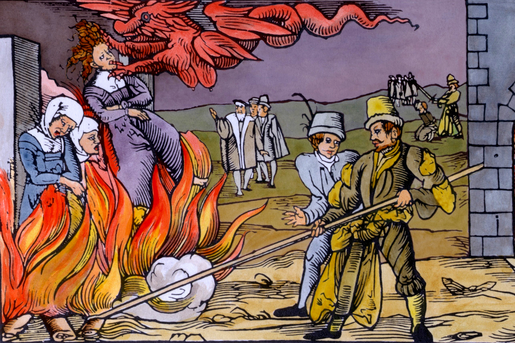 Ženy upálené za čarodějnictví v německém Derneburgu v říjnu 1555 (kolorovaný dřevoryt).
