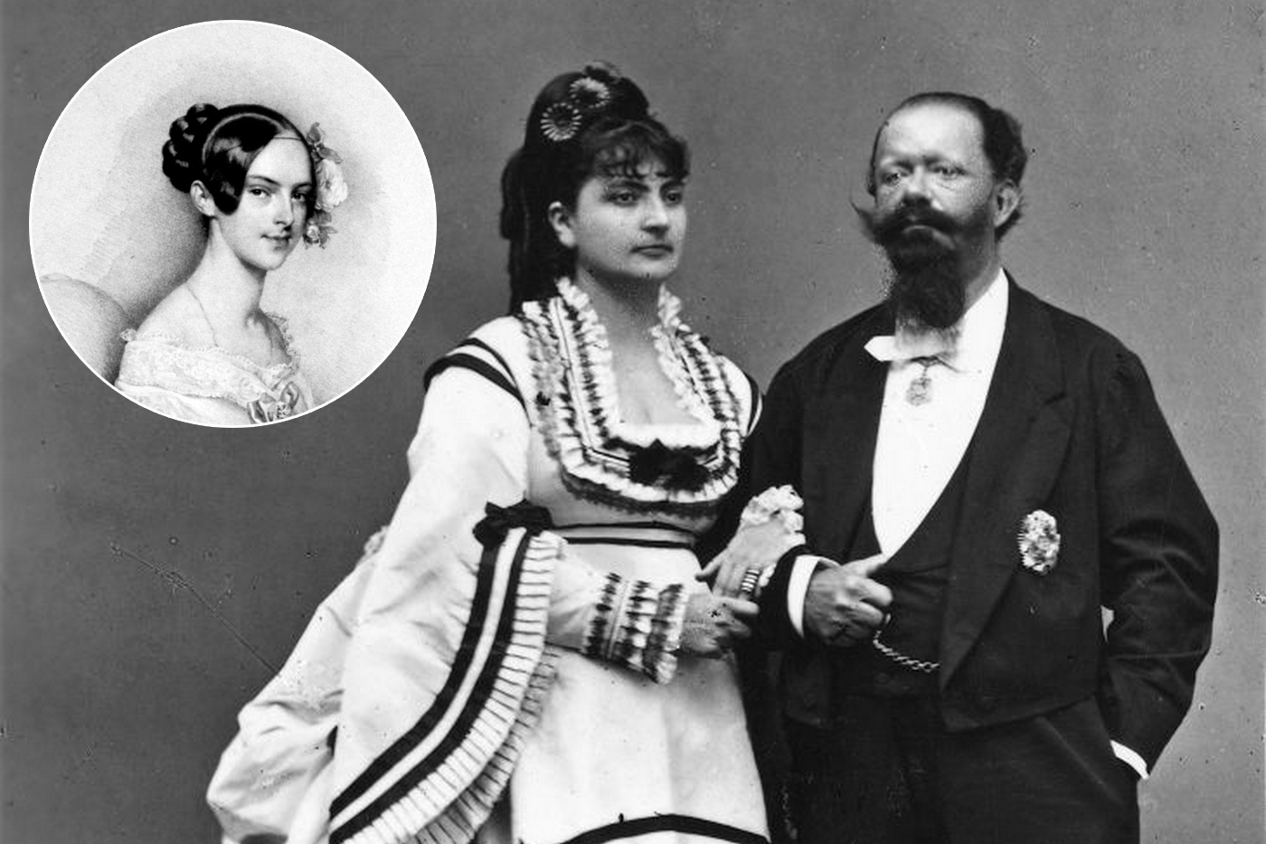 Viktor Emanuel II. se svou milenkou a druhou manželkou Rózou Vercellanovou. Ve výřezu jeho první žena Adelheid Rakouská.