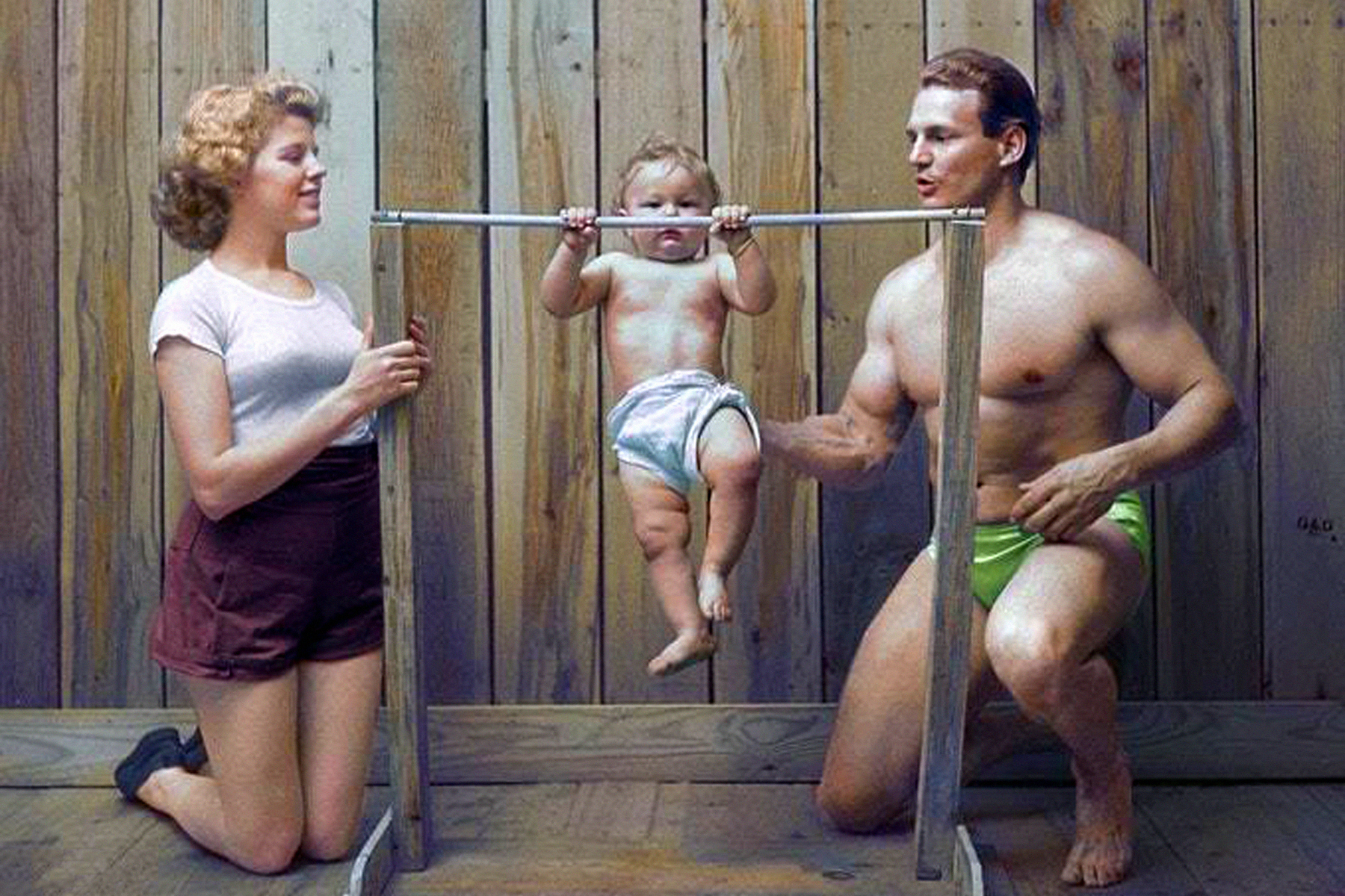 Kulturista Gene Jantzen s manželkou a jedenáctiměsíčním synem Kentem roku 1947 – snímek pořídil budoucí slavný režisér Stanley Kubrick.