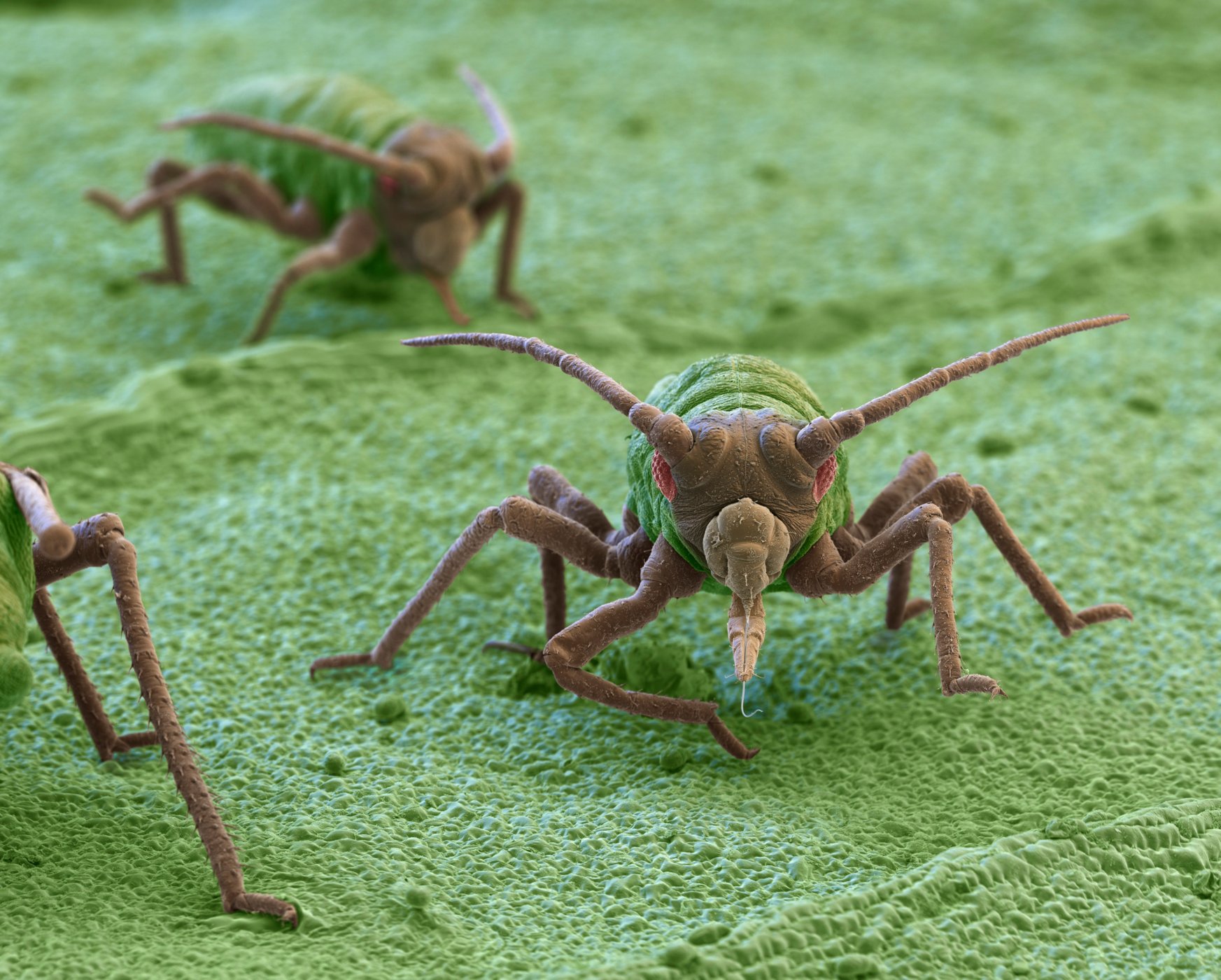 Snímek z elektronového mikroskopu je kolorovaný, takovéto barvy mšice ve skutečnosti pochopitelně nemá. (foto: Profimedia)