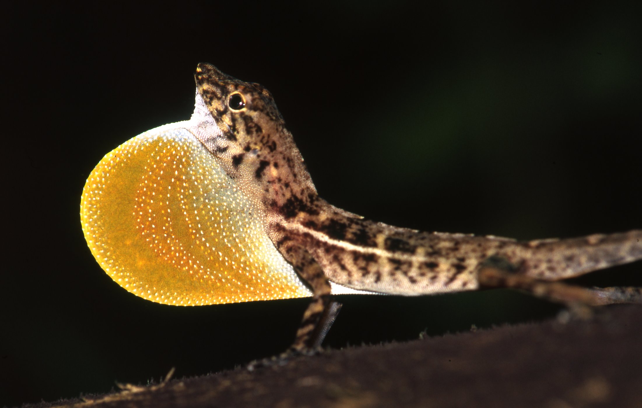 Samec leguánka Norops polylepis vypínající hrdlo. Nápadně zbarvený hrdelní lalok samci ukazují při teritoriálním chování nebo když se dvoří samicím. (zdroj: Jan Ševčík)