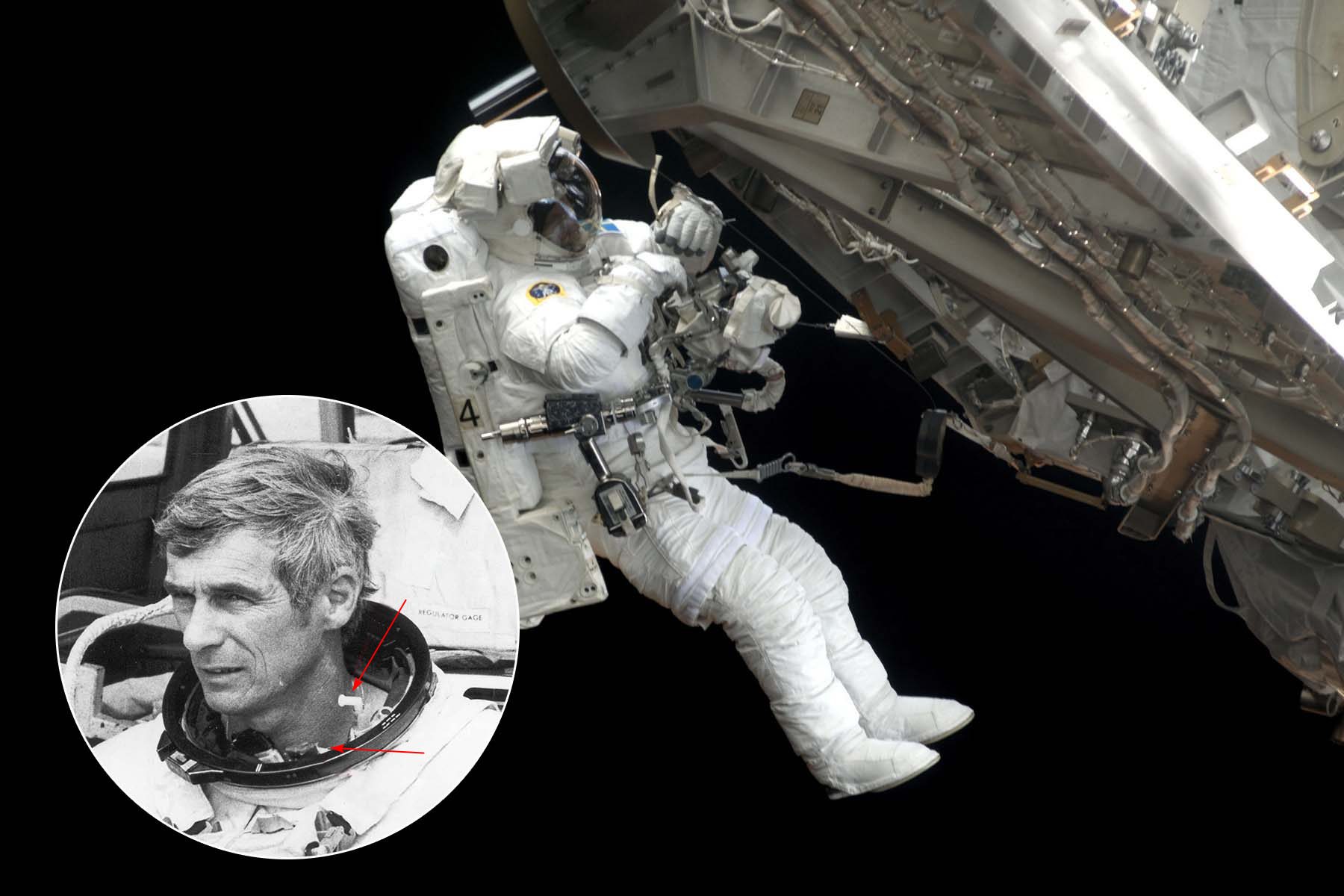 Christer Fuglesang, při výstupu na ISS v rámci mise STS-128. Ve výřezu Eugene Cernan během výcviku na historickém snímku, který zachytil i ovocnou tyčinku a ventil s přívodem vody.