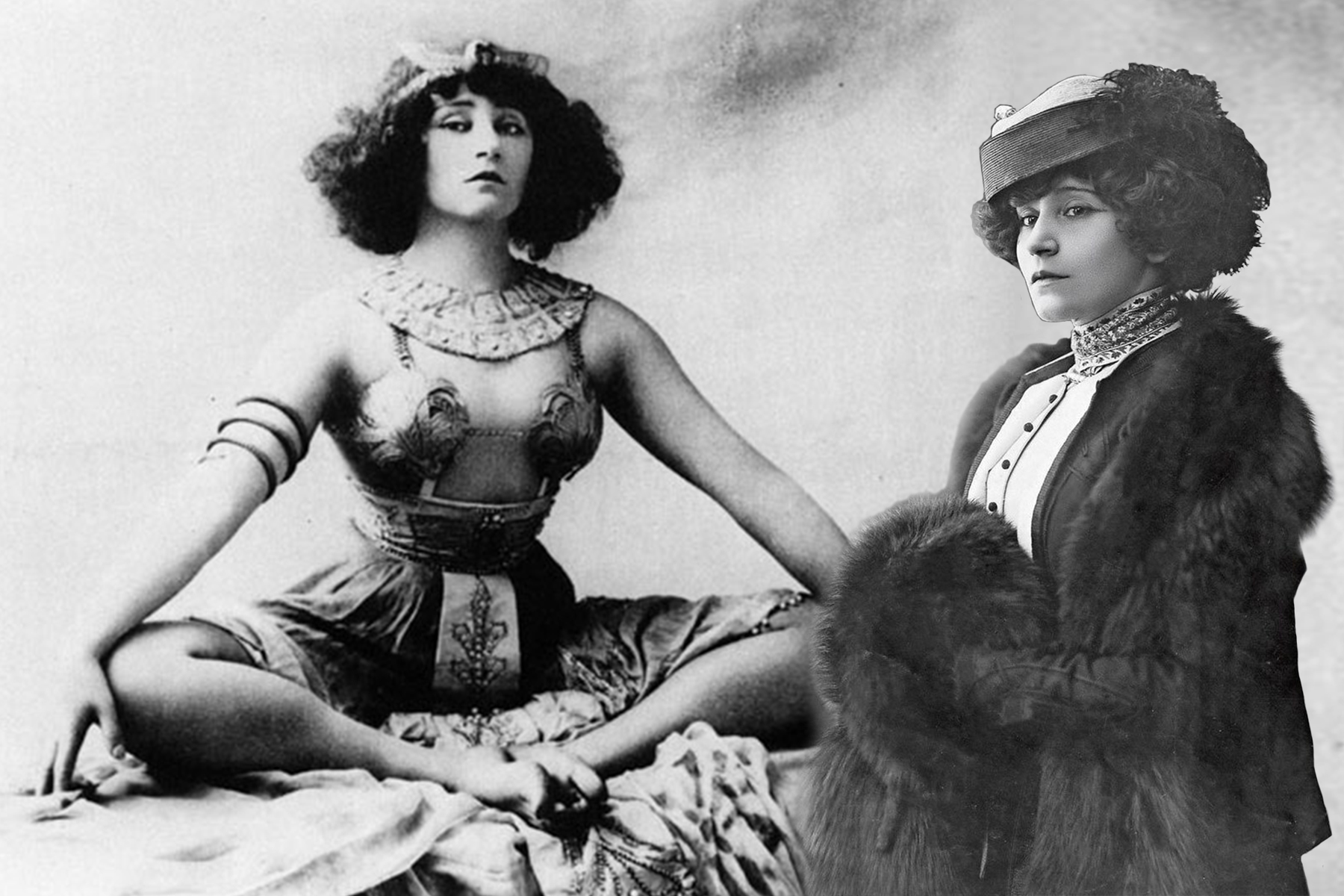 Sidonie-Gabrielle Colette jako herečka ve hře Sen o Egyptě, Paříž 1907. Vpravo portrét od Henri Manuela.