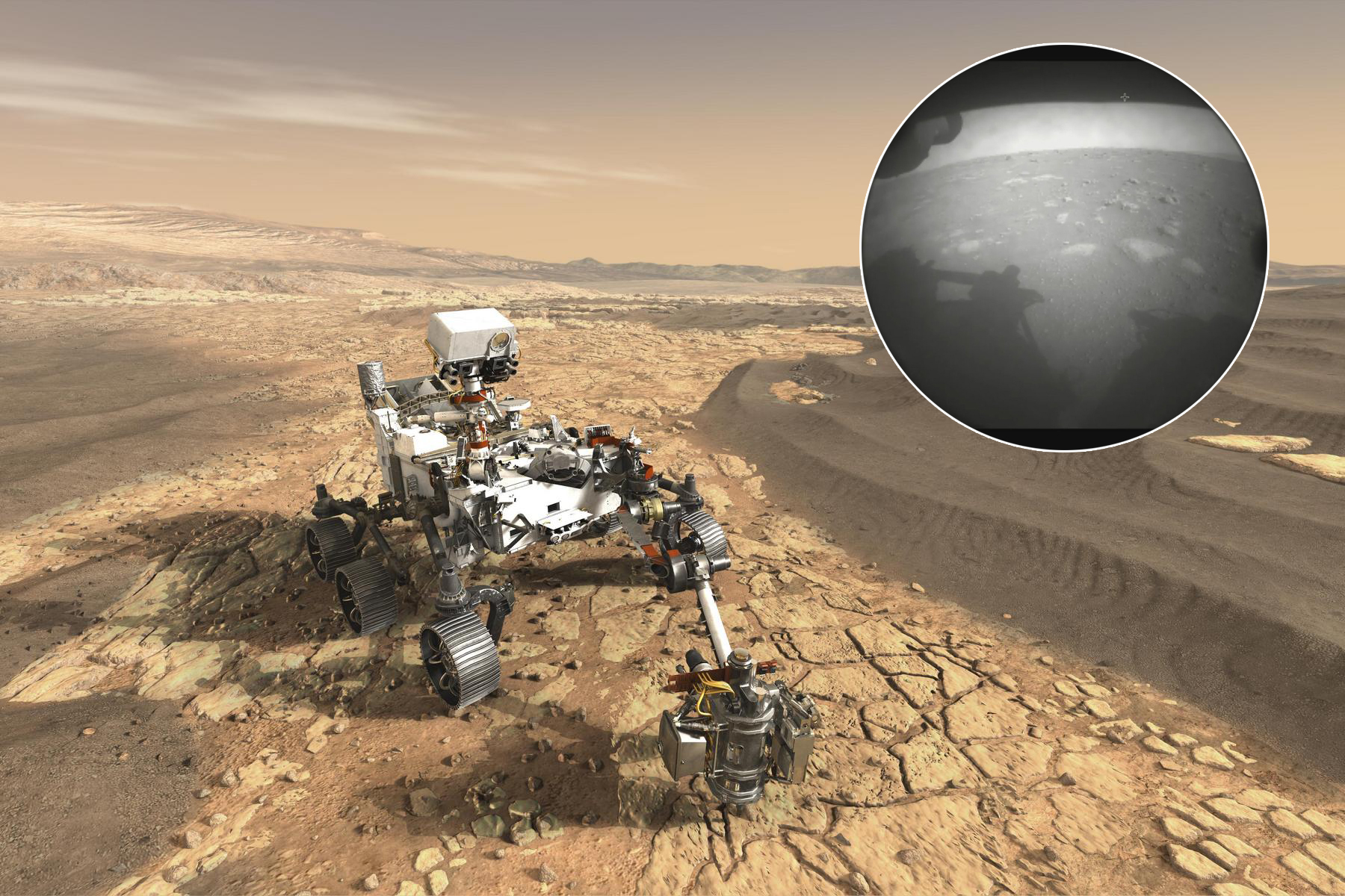 Americká sonda Perseverance úspěšně přistála na Marsu. Krátce po přistání poslala první snímky (zatím pořízené přes prachovou krytku).