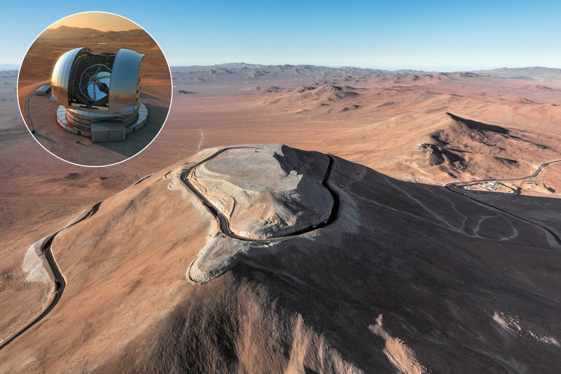 Budoucí největší teleskop světa, Extrémně velký dalekohled (ELT), staví Evropská jižní observatoř na hoře Cerro Armazones v severním Chile, v nadmořské výšce 3 046 metrů. Oblast patří k nejsušším na planetě a tamní klidná atmosféra poskytuje vhodné podmínky ke sledování nejvzdálenějších objektů ve vesmíru. Snímek z roku 2015 zachycuje dokončení hrubých zemních prací. (zdroj: ESO CC BY 4.0)