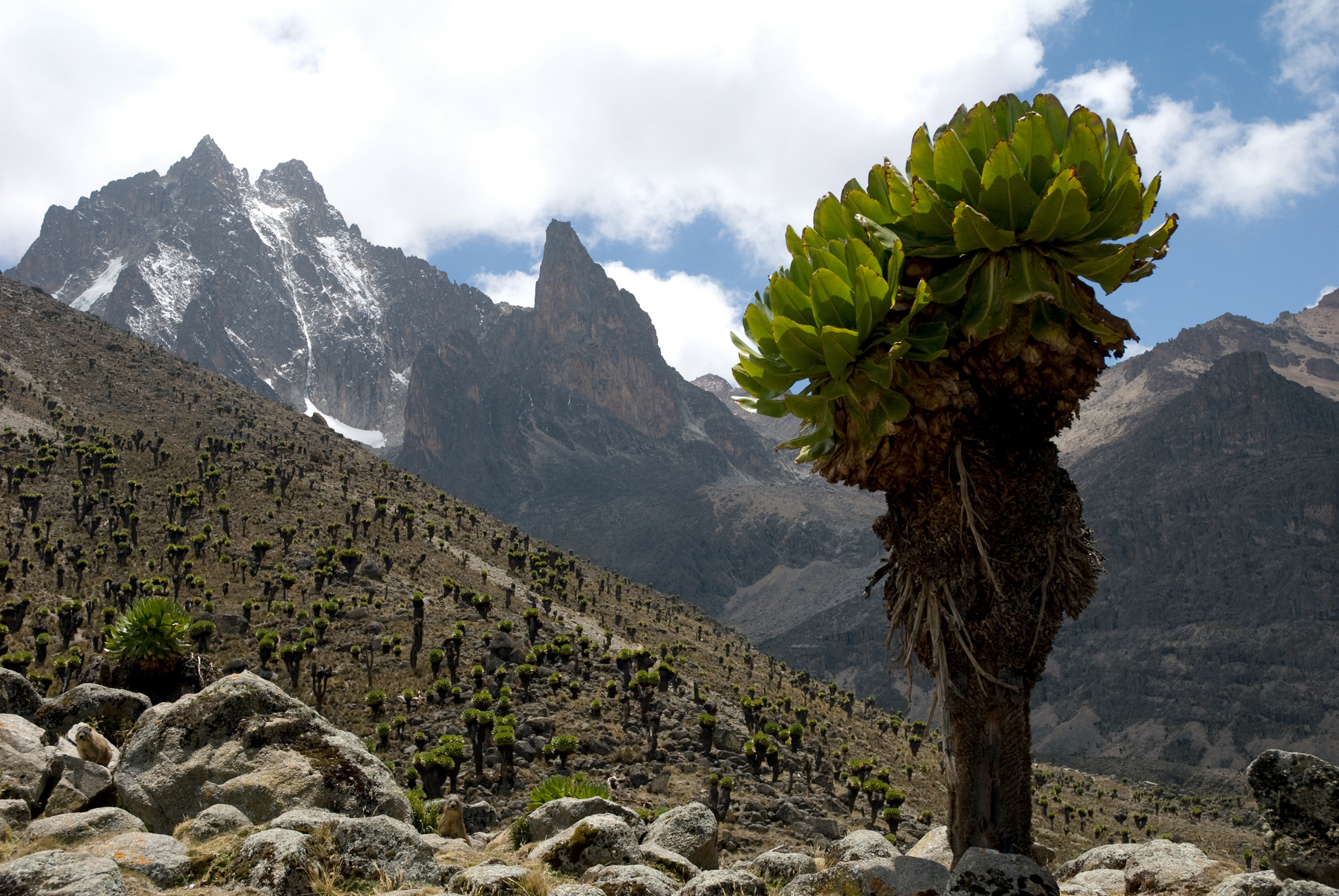 Mount Kenya měří na výšku 5 199 metrů a od roku je součástí kulturního dědictví UNESCO. Původním názvem hory, jež mu dali Kikuyové byl Kirinyaga (Zářící hora). Dnešní jméno, ale zřejmě pochází od sousedního kmene Kamba. Kambané horu nazývali Kee Nyaa (Místo pštrosa). (zdroj: Shutterstock)
