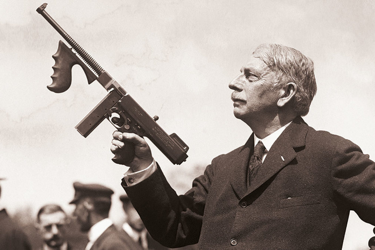 John Thompson představuje svůj nový vynález – automatickou pušku vážící pouhých sedm liber (3,1 kg), schopnou vypálit až 120 ran za minutu.