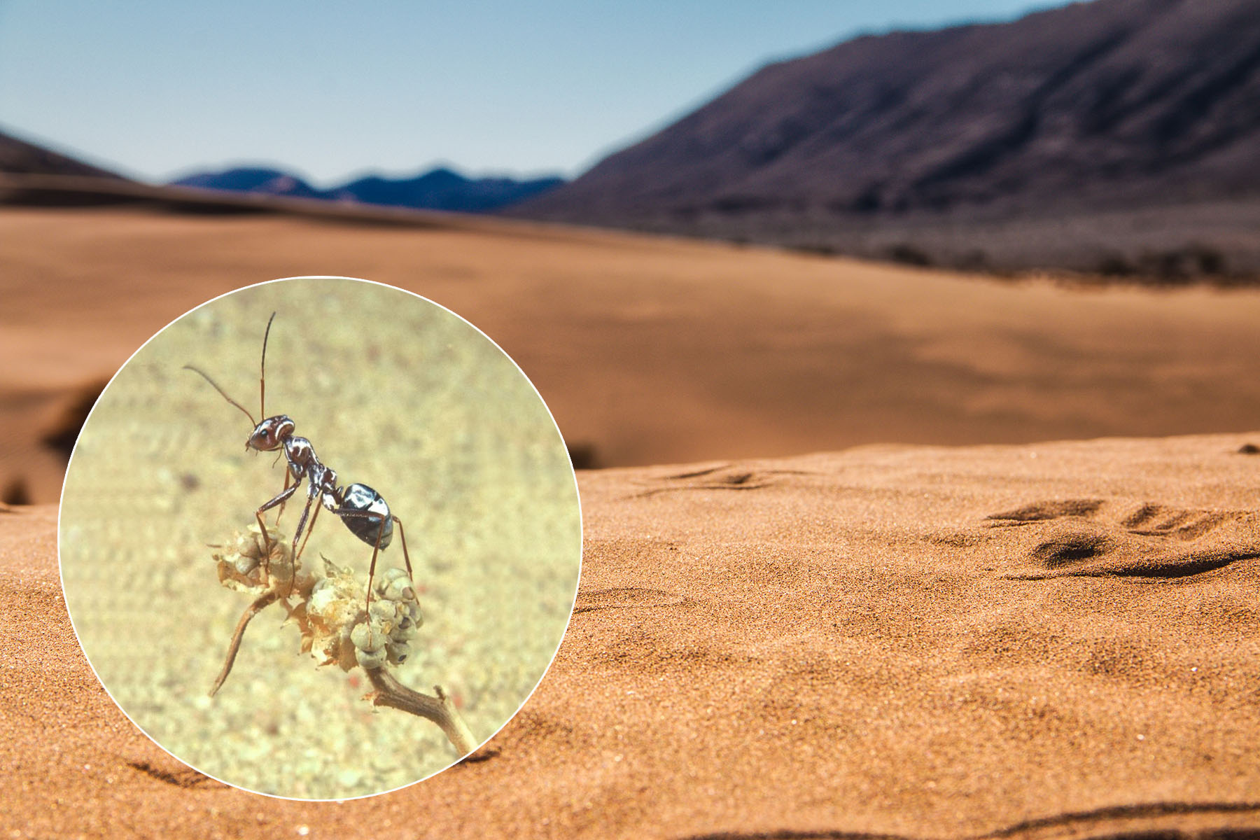 Stříbrný mravenec Cataglyphis bombycinus na chvíli uniká žhavé plotně saharského písku vyběhnutím na uschlou rostlinu.