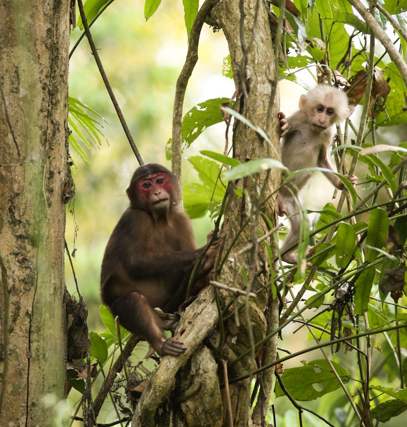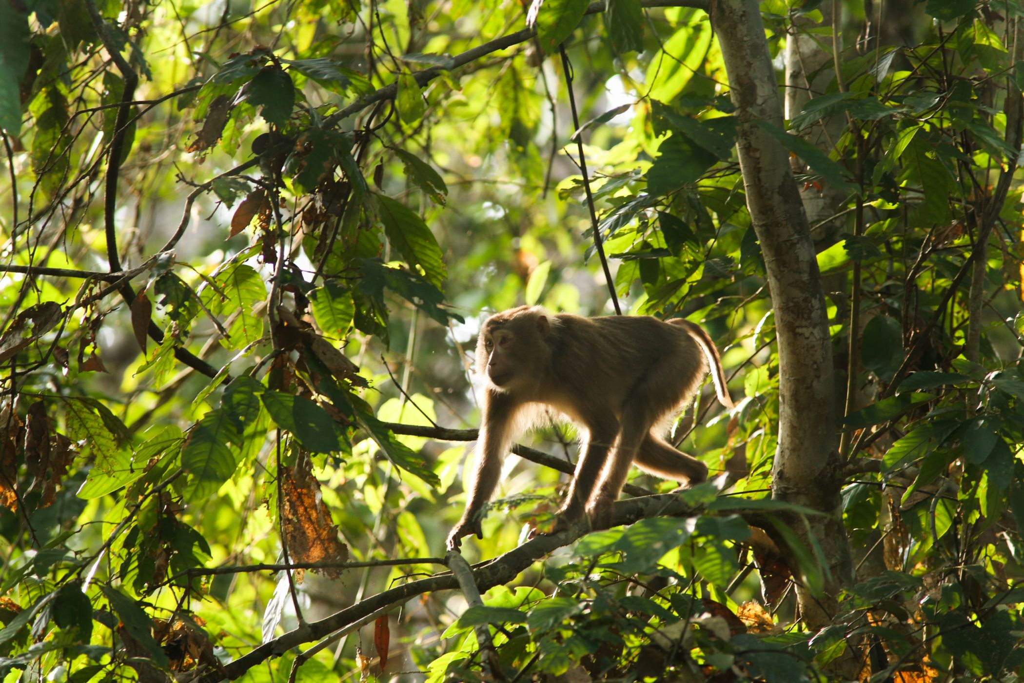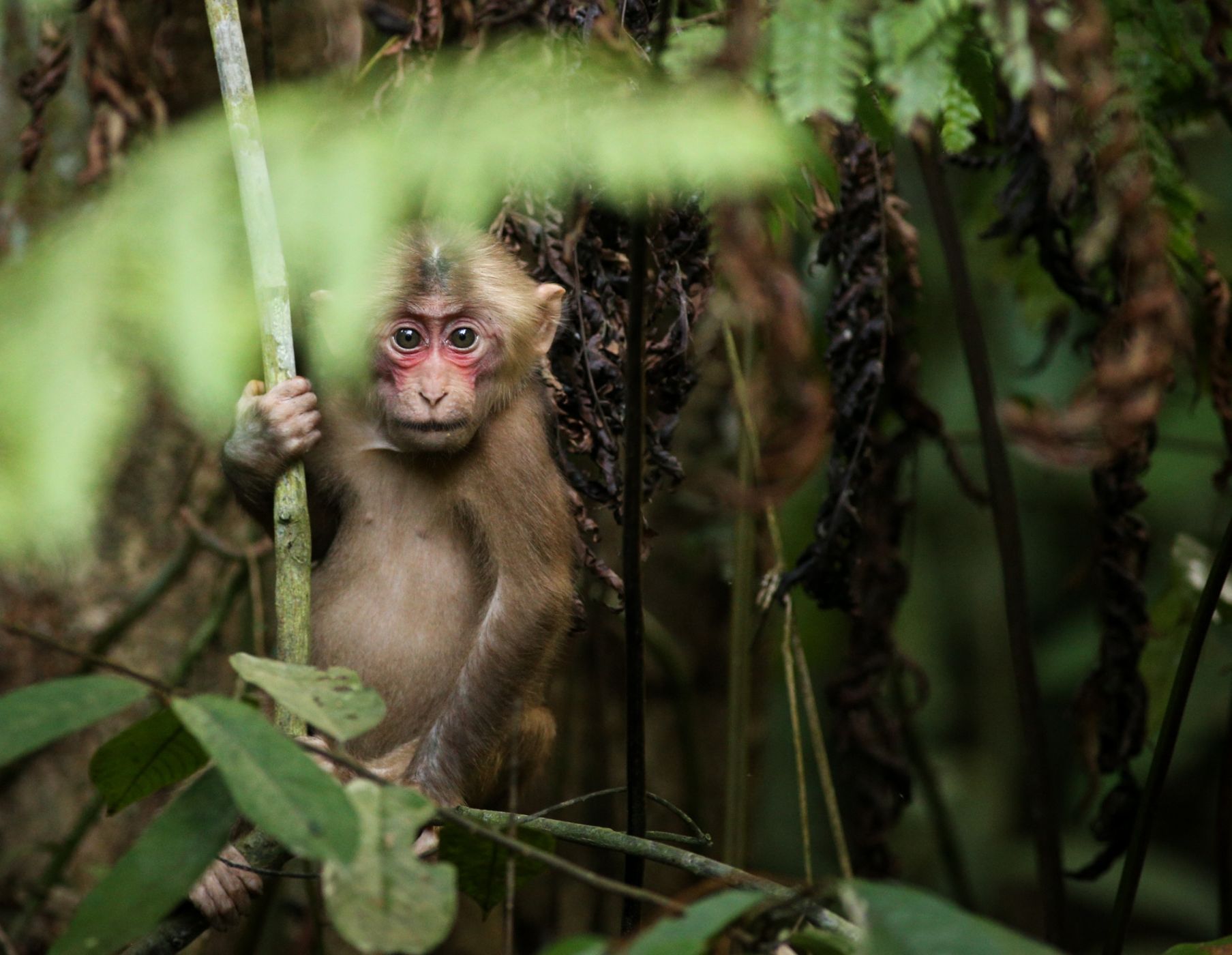• Mládě makaka medvědího (Macaca arctoides) na nás kouká skrze podrost kolem cesty.