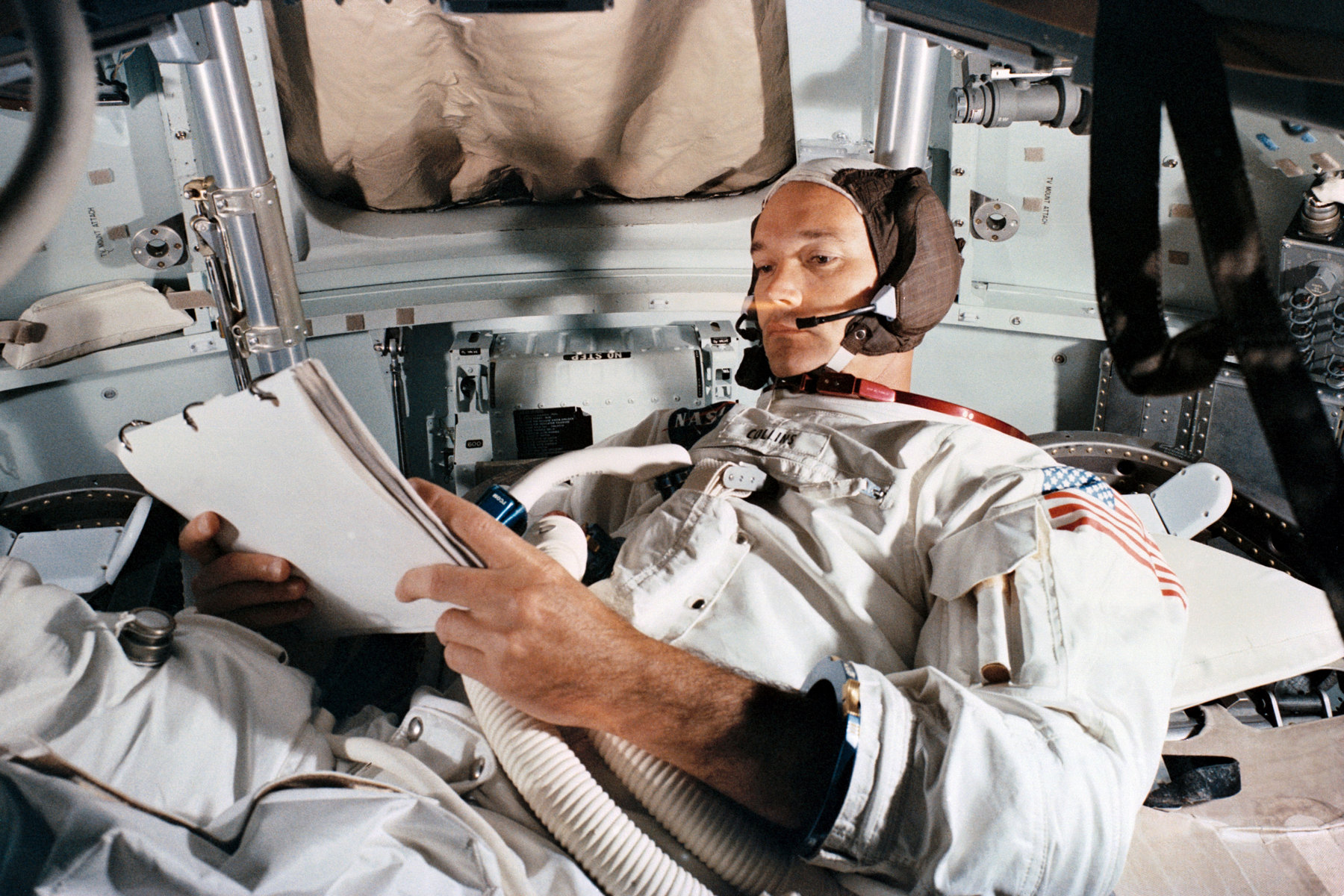 Michael Collins během tréninku na misi Apollo 11 v simulátoru velitelského modulu. Snímek byl pořízen 19. června 1969, tedy necelý měsíc před startem mise.