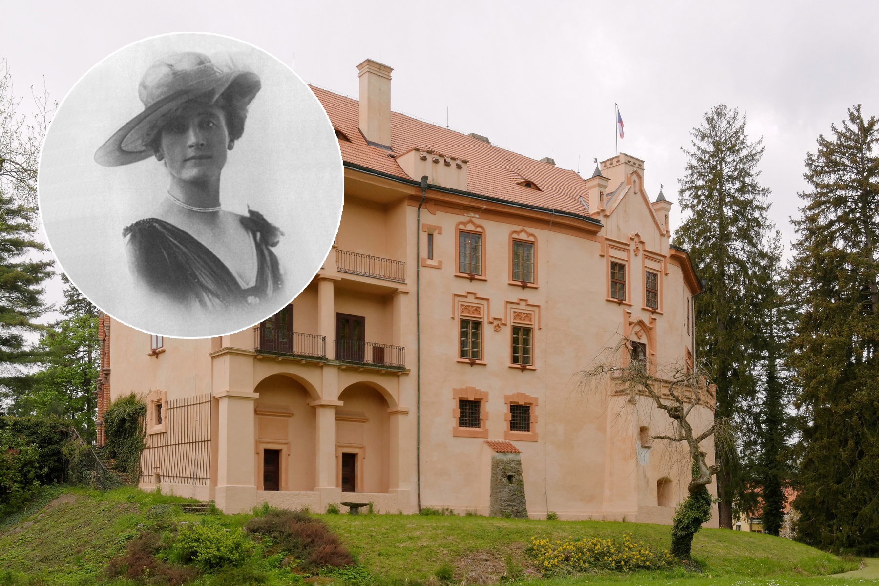 Zámek Vrchotovy Janovice byl původně vodní tvrzí, postavenou na přelomu 15. a 16. století. Během 18. století získal svůj rokokový vzhled. Ve výřezu portrét Sidonie Nádherné kolem roku 1917.