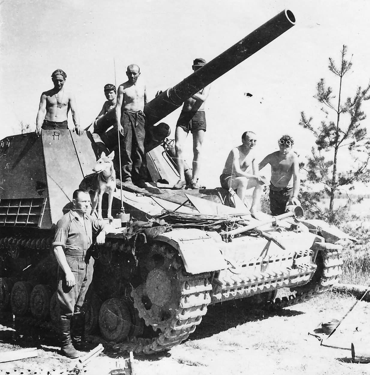 Příslušníci 12. tankové divize se samohybným „čmelákem“ v Kuronsku (dnešní Lotyšsko) v roce 1944.