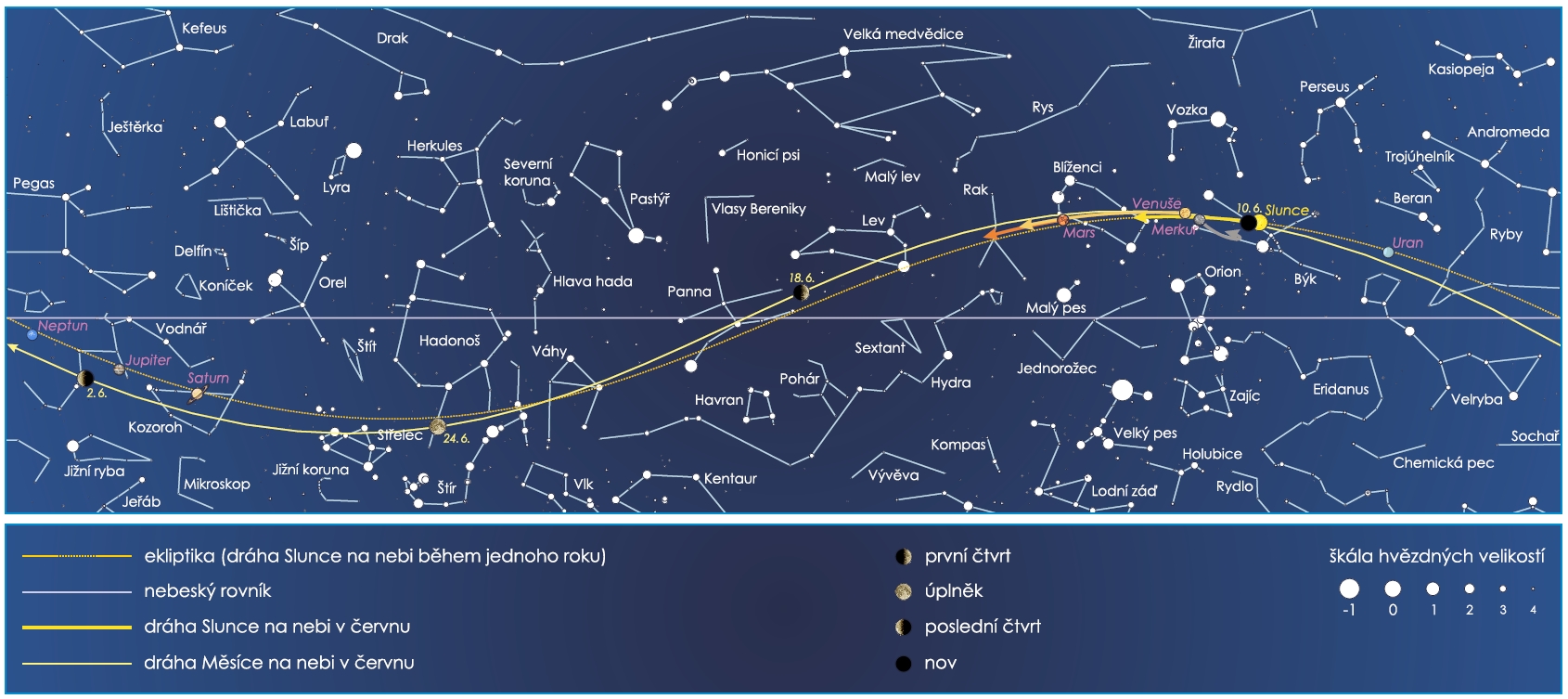 Obdélníková mapa uvádí přibližné polohy významných těles Sluneční soustavy na červnové obloze. (foto: Jan Píšala)