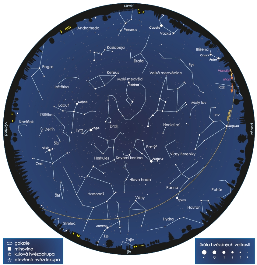 Kruhová mapa zobrazuje podobu nočního nebe 15. června 2021 ve 22:00 středoevropského letního času (SELČ). Na počátku měsíce platí pro 23:00 SELČ, na jeho konci pro 21:00 SELČ. (foto: Jan Píšala)