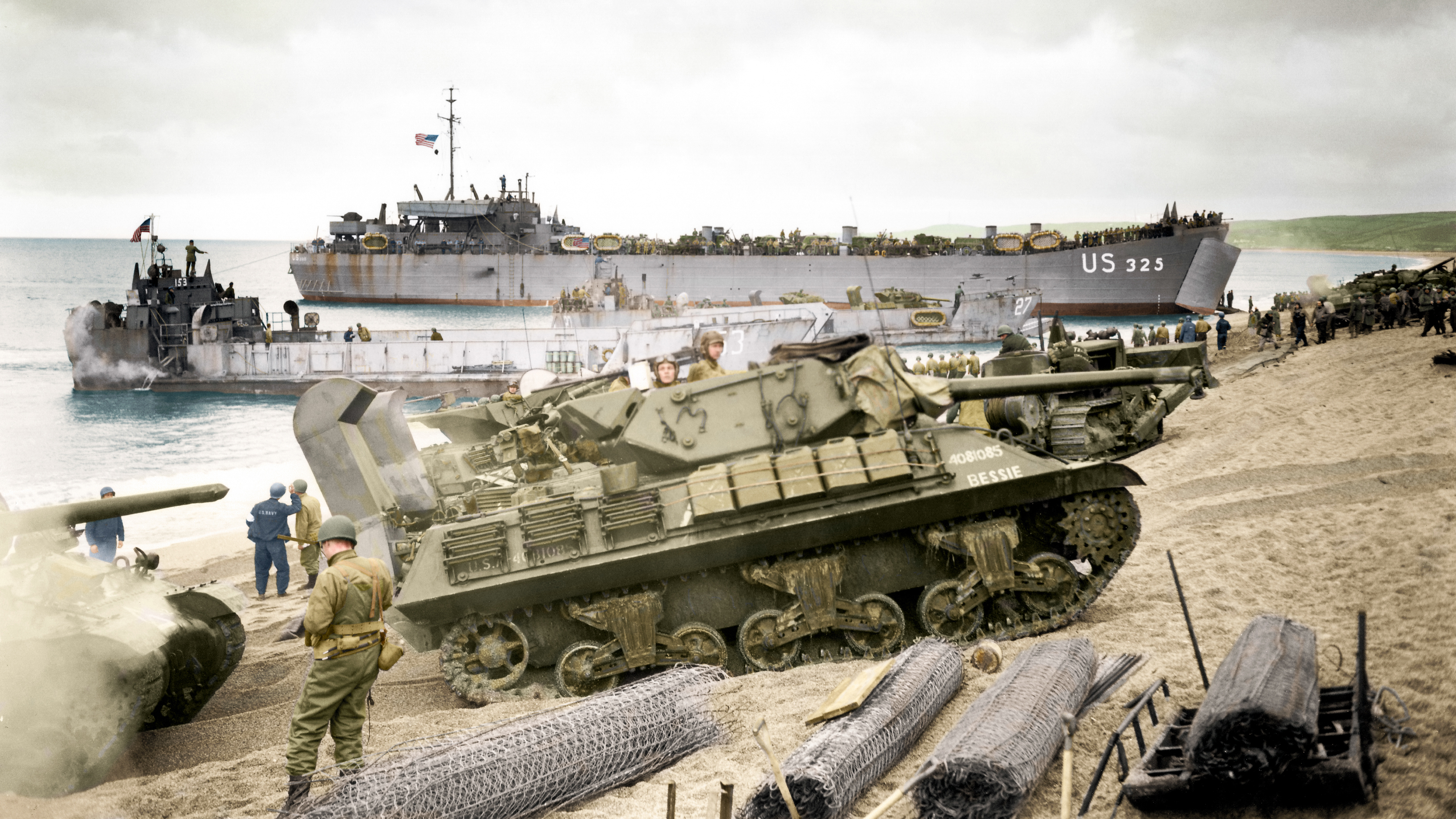 Americké stíhače tanků M10 se vyloďují na jedné z invazních pláží.