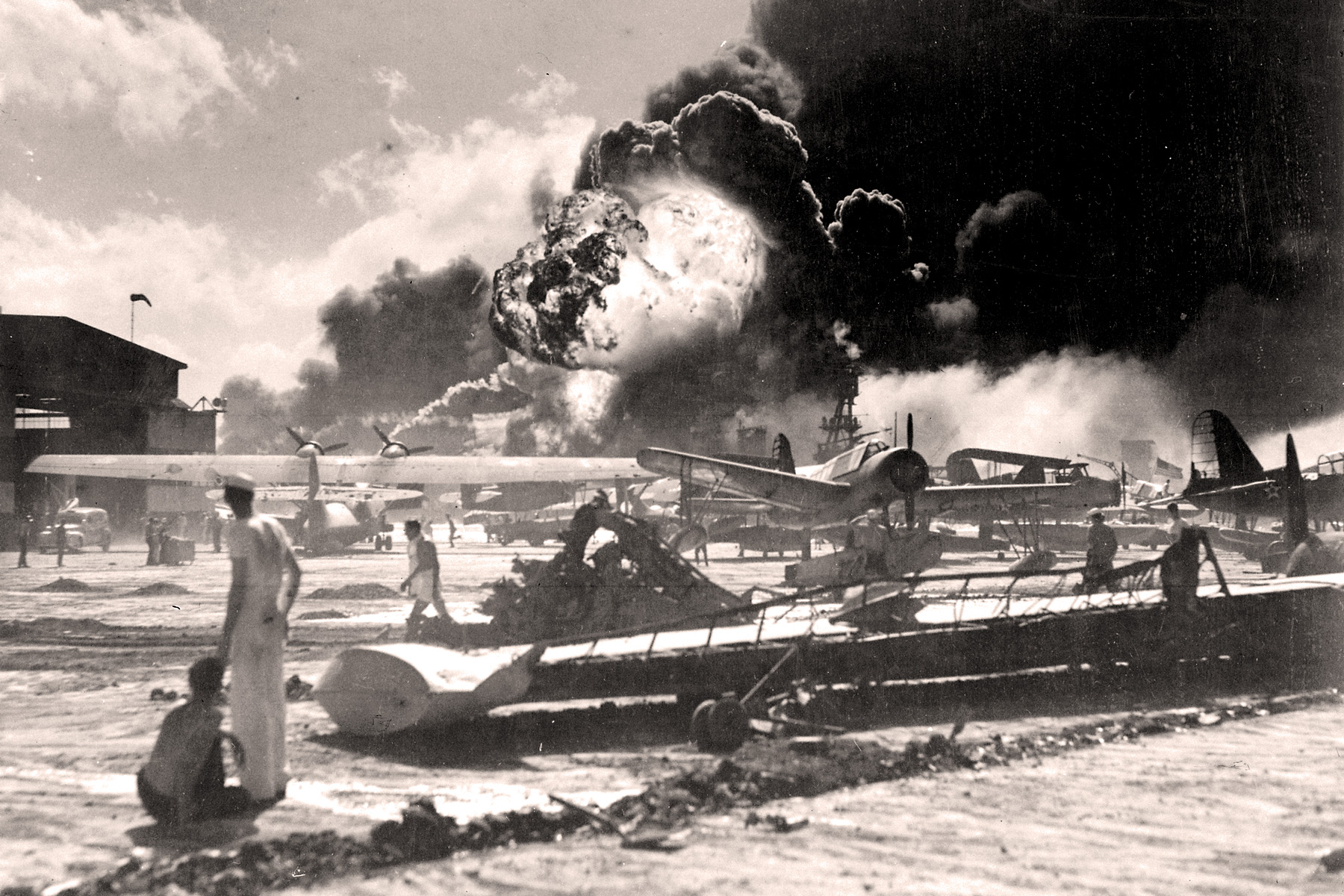 Námořníci na Fordově ostrově během japonského útoku na Pearl Harbor. V pozadí explodující torpédoborec USS Shaw.