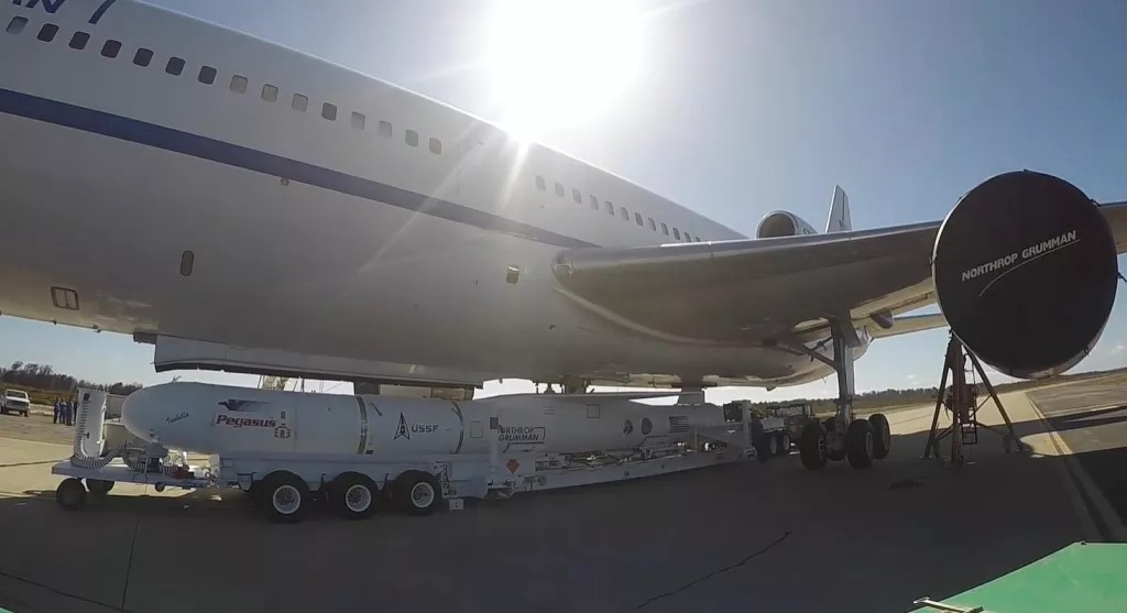 Připojování rakety Pegasus XL se satelitem TacRL-2 k mateřskému letounu Lockheed L-1011 TriStar „Stargazer“.