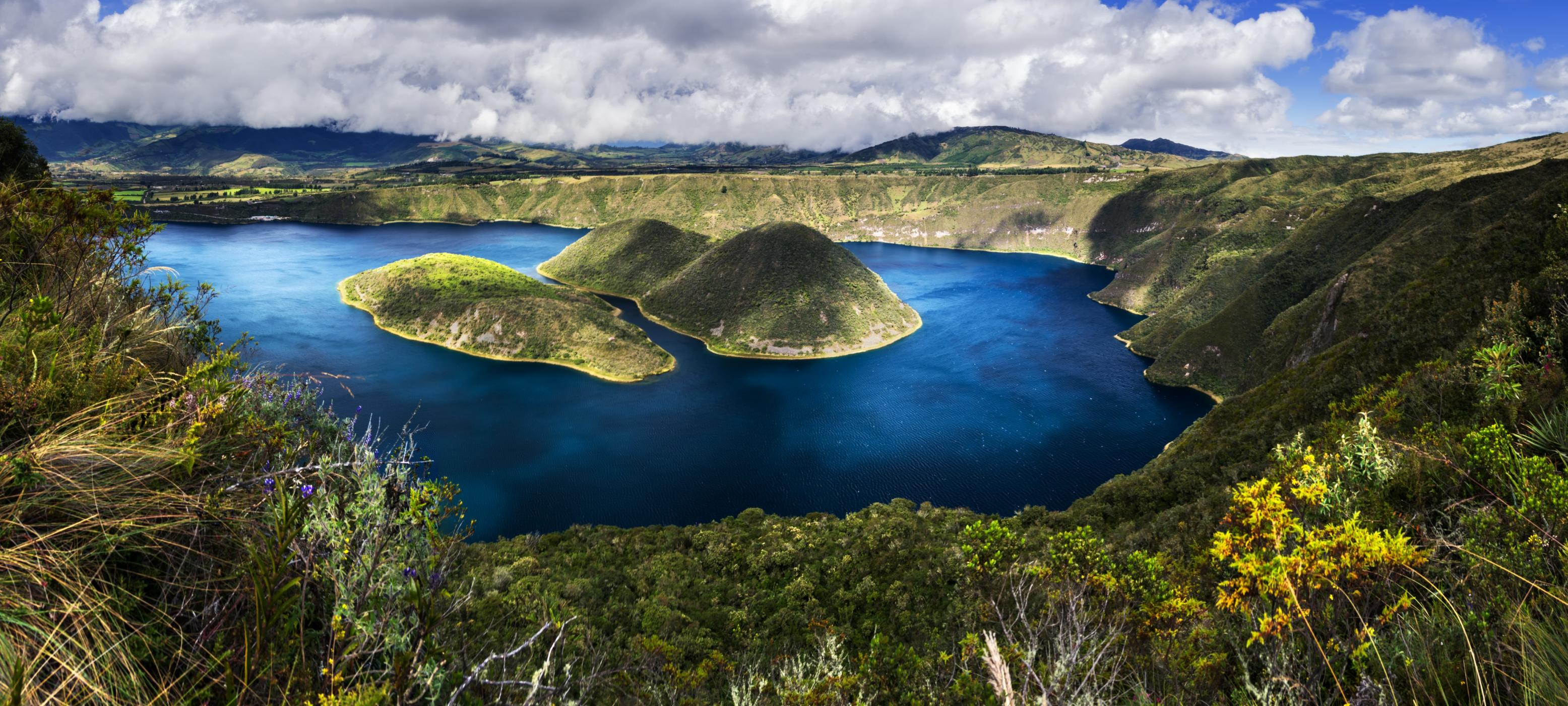 Jeden z mnoha výhledů na jezero Cuicocha korunované dvojicí ostrovů.