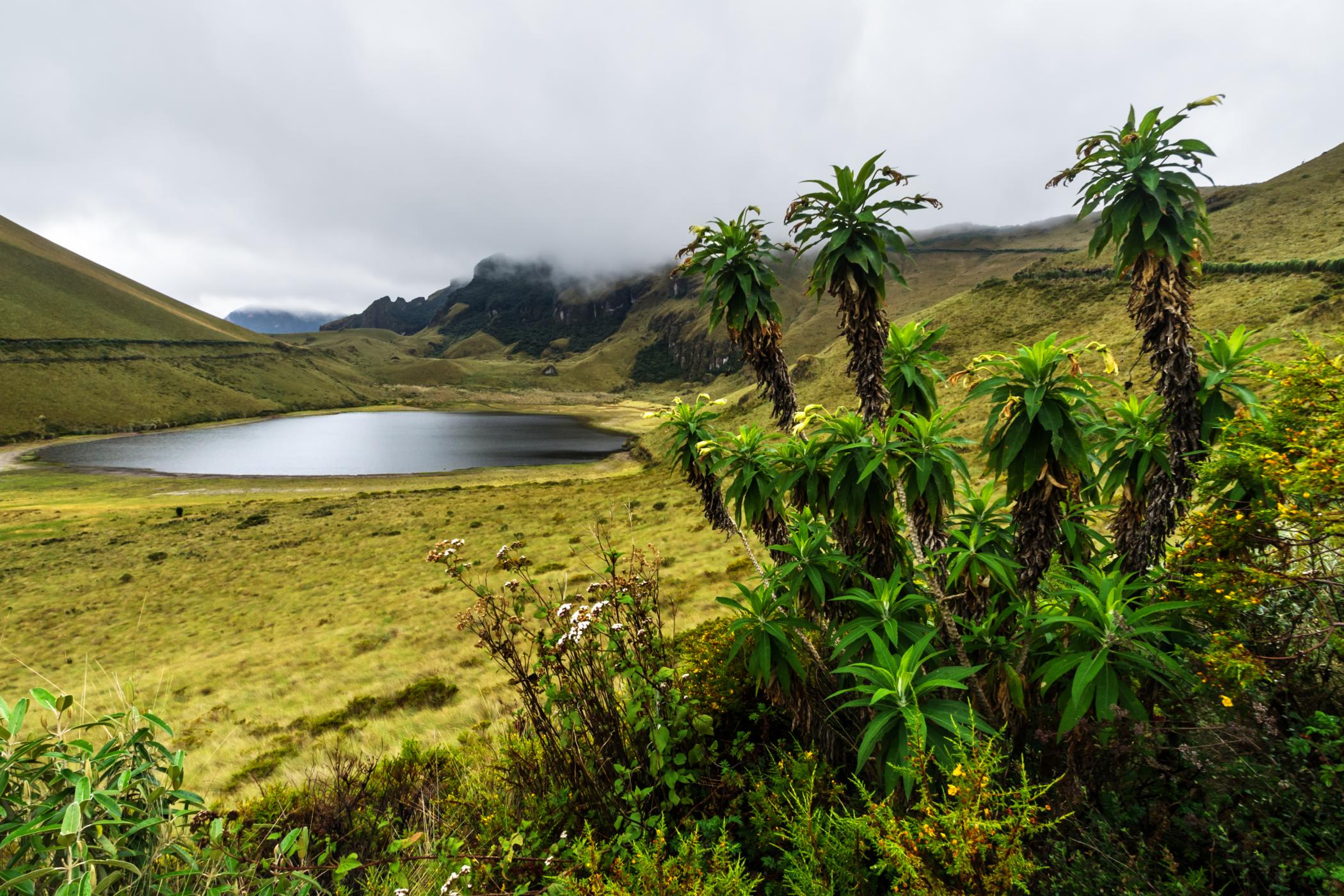 Panorama jezer Mojanda ve chvíli, kdy se těžké mraky přeci jen trochu zvedly.