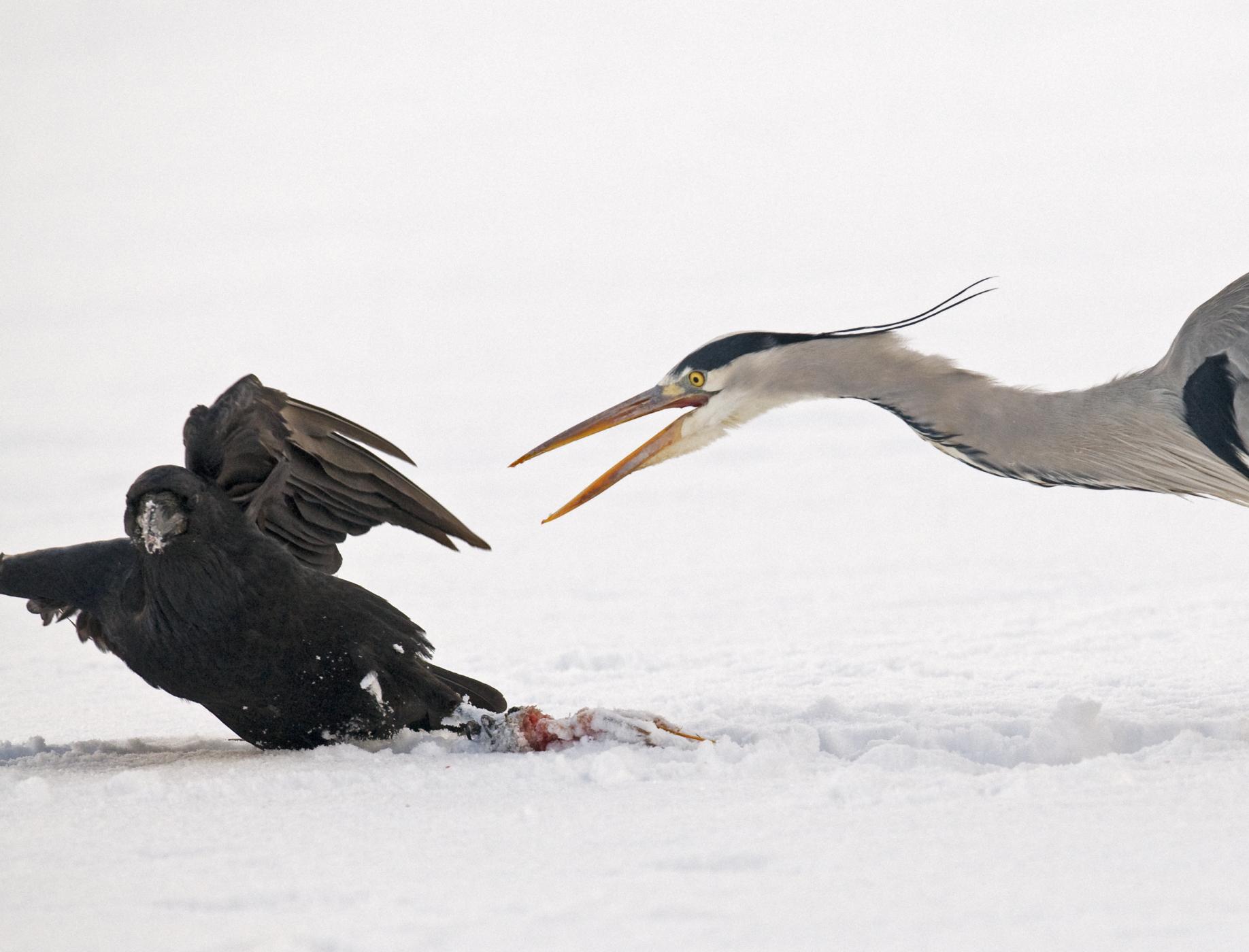 • Vyhládlá volavka popelavá odhání od potravy krkavce.