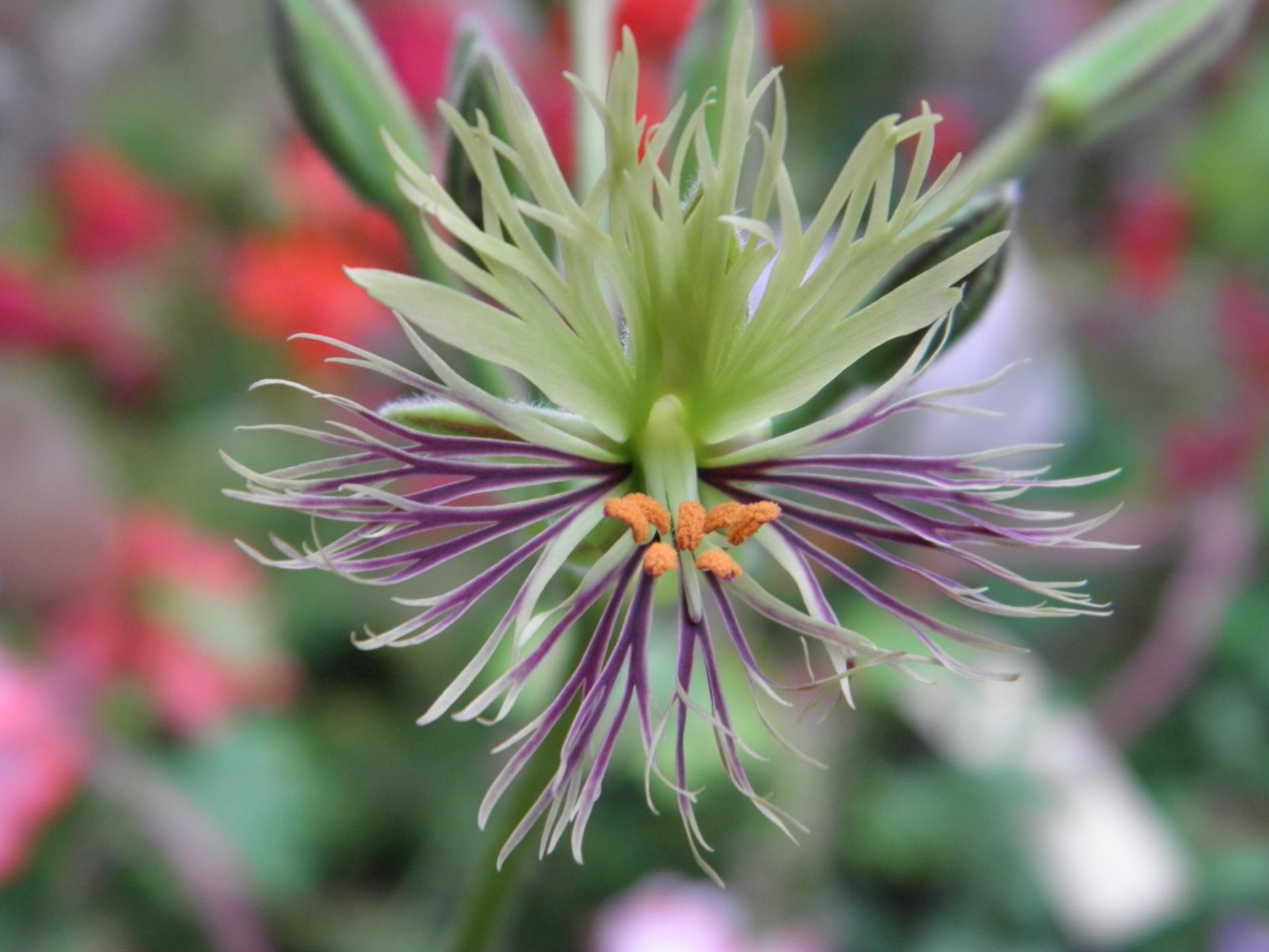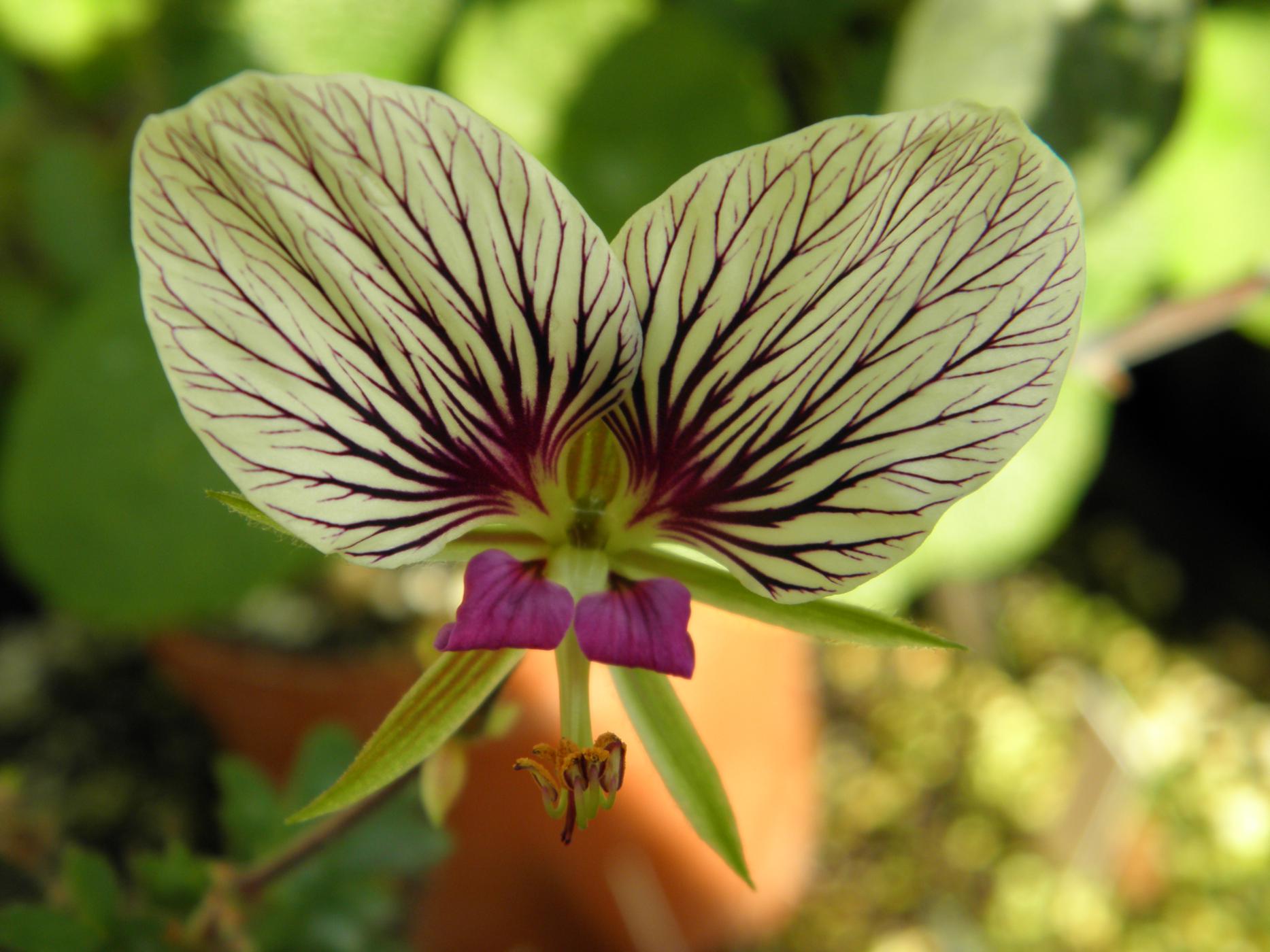 Bizarní květ vyšlechtěného muškátu Pelargonium schizopetalum.