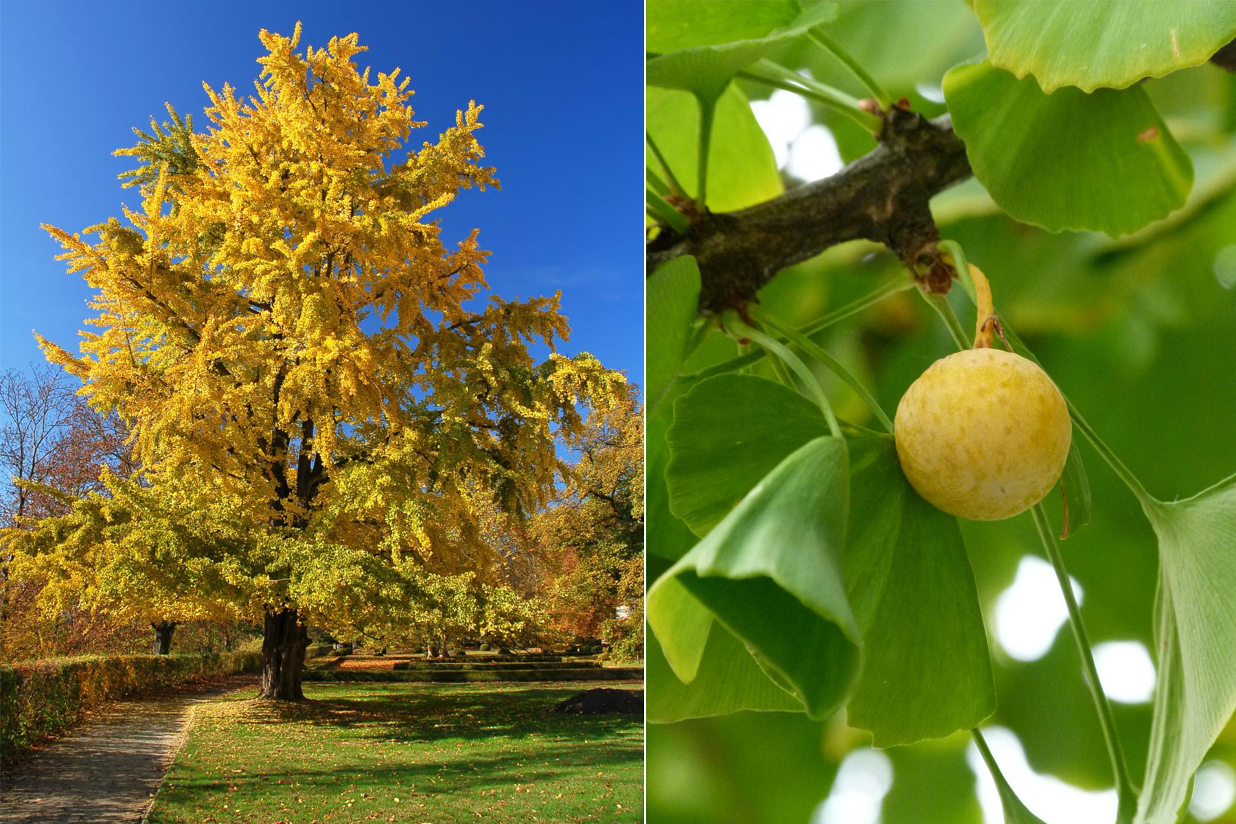 Na podzim se jinany velmi pěkně vybarví do žluta. Vpravo plod jinanu dvoulaločného.