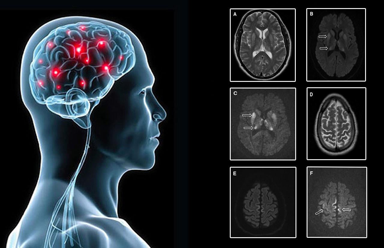 Mozek pacienta s Creutzfeldtovou–Jakobovou chorobou. Šipky ukazují místa zasažená prionem.