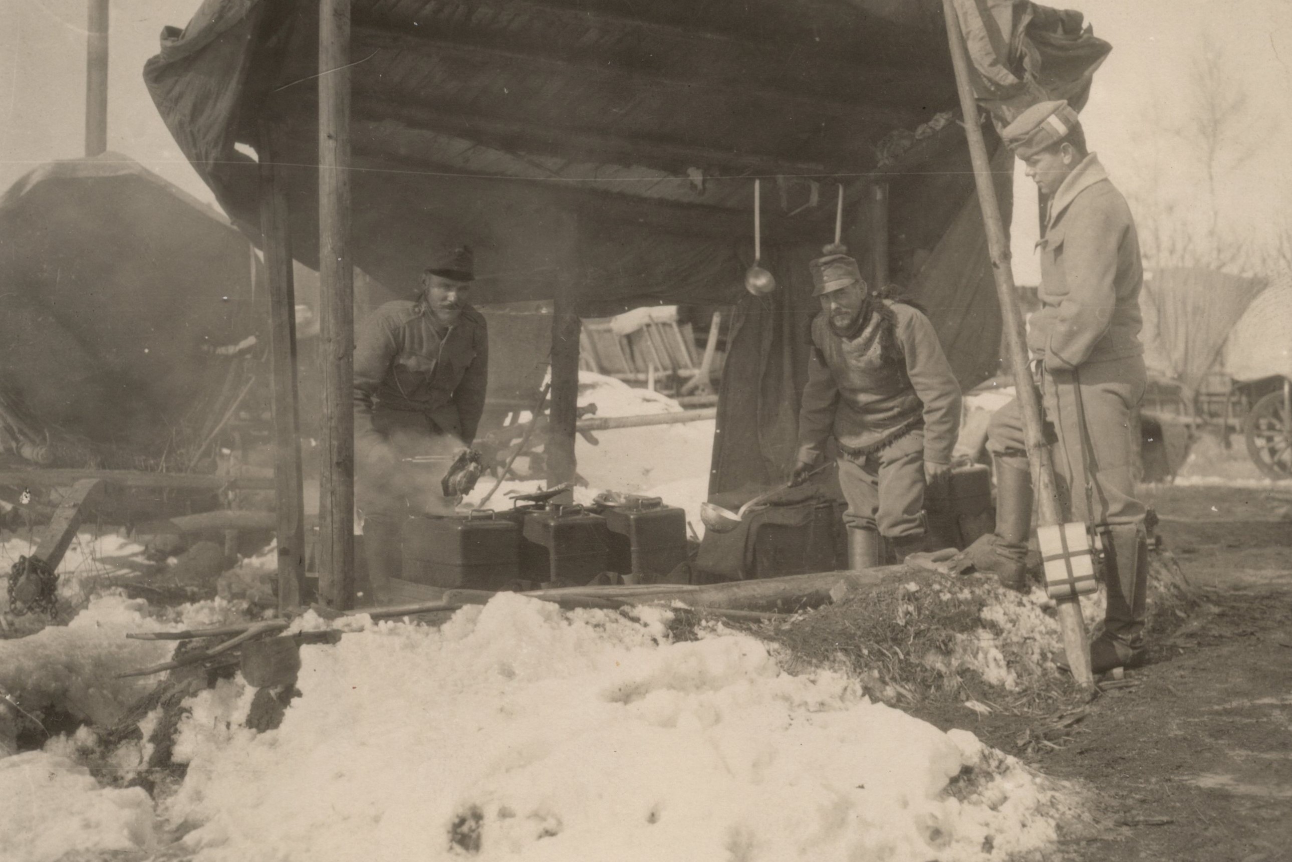 Polní kuchyně na italské frontě, odkud se bude jídlo odneseno k jednotlivým oddílům