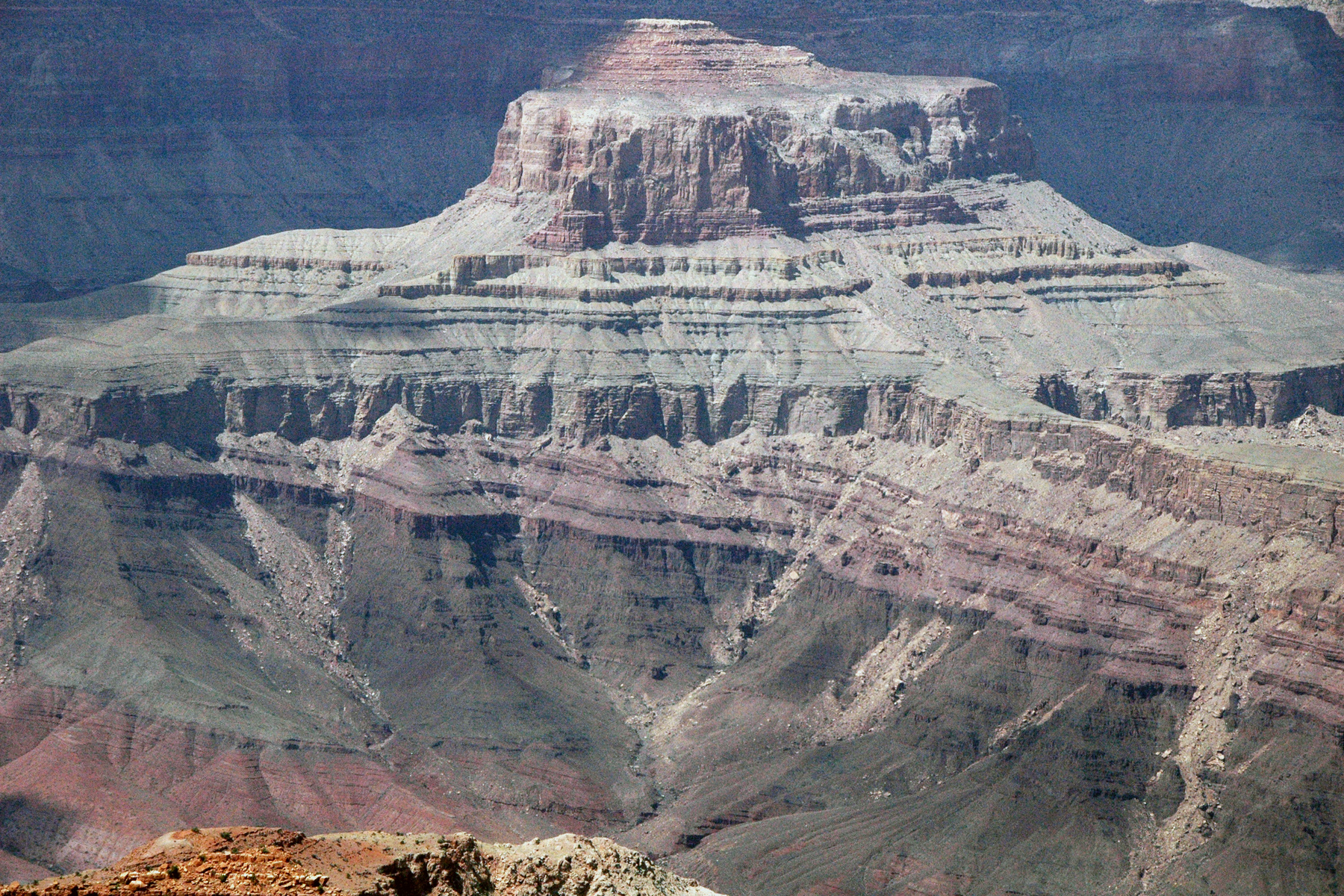 Pohled do Grand Canyonu s dobře patrným předělem v geologickém záznamu, zhruba uprostřed snímku.