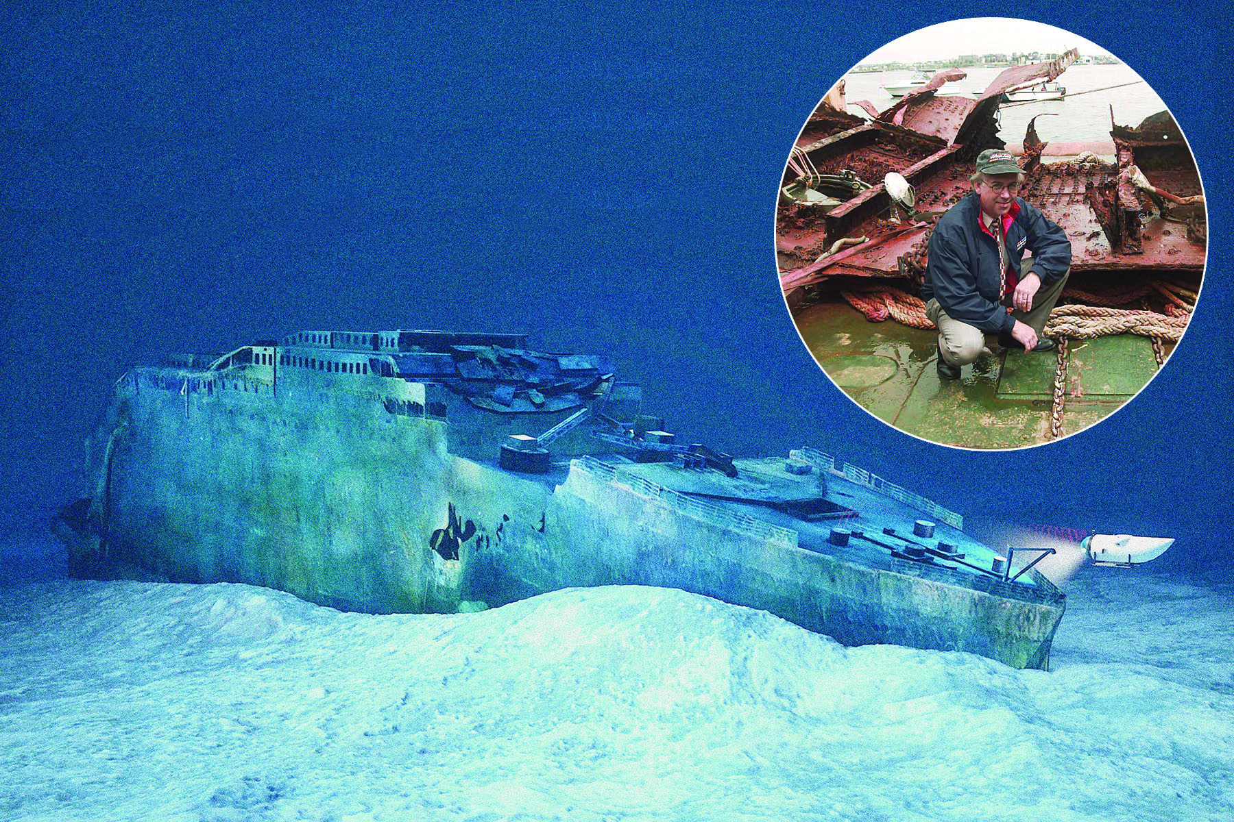 Rozlomený vrak Titanicu leží na mořském dně zhruba 600 km od kanadského ostrova Newfoundland. Ve výřezu Allan Carlin, šéf RMS Titanic Inc., pózující před dvacetitunovým kusem trupu, vyzvednutým v roce 1998.