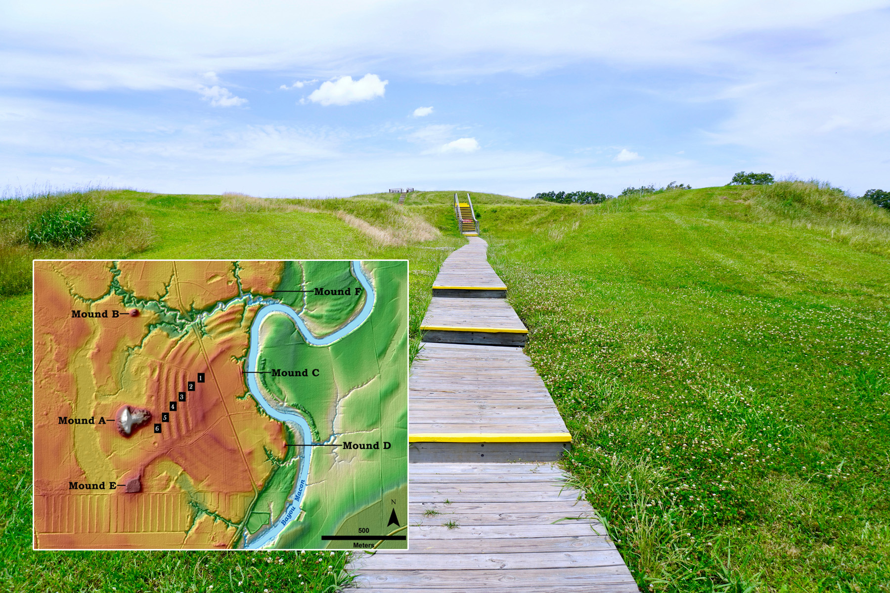 Ve výřezu mohyly a náspy v lokalitě Poverty Point. Vybudování obrovských mohyl a náspů v Poverty Point vyžadovalo velkou a dobře organizovanou pracovní sílu.