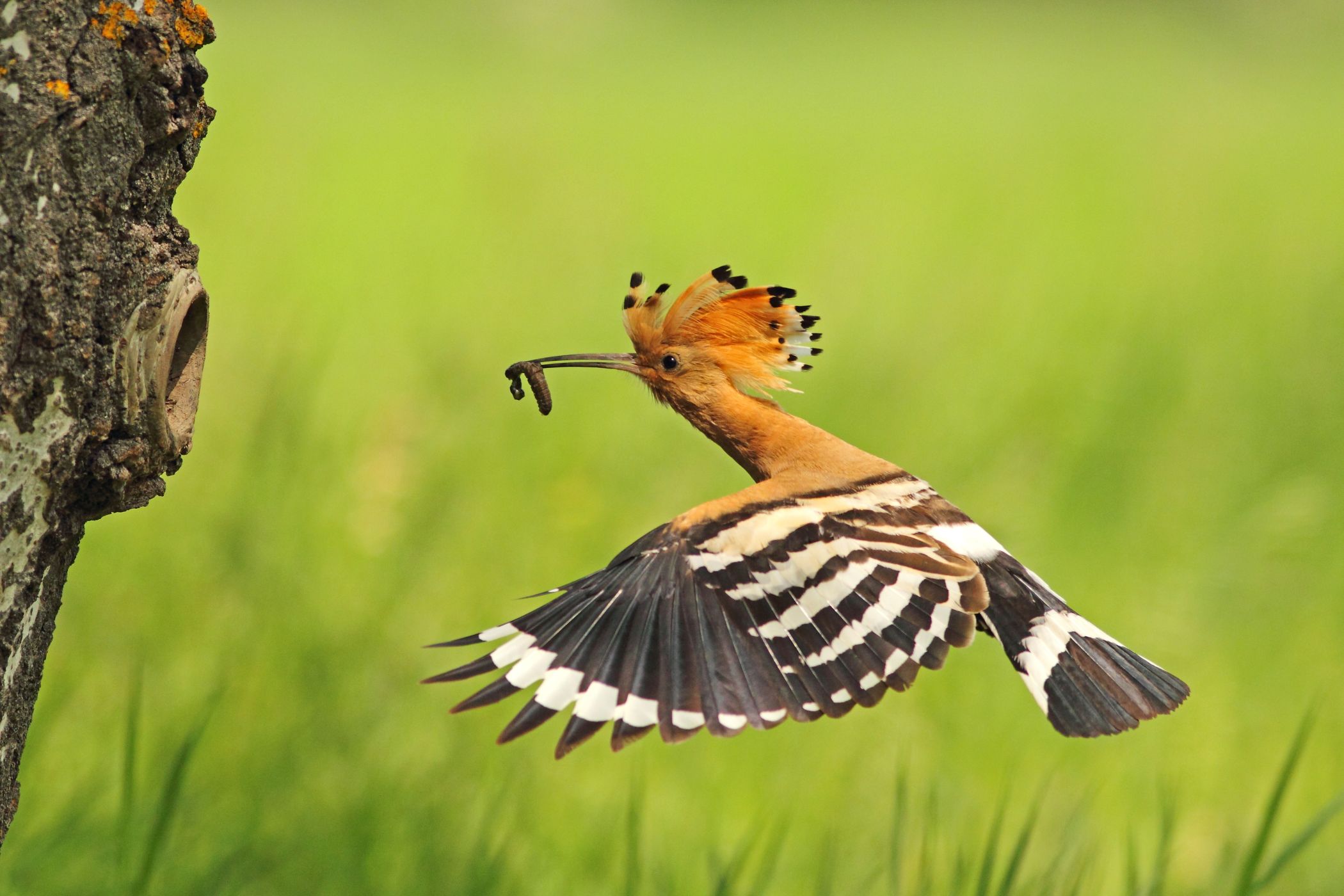 Sameček dudka spěchá nakrmit mláďata, která jsou i po opuštění hnízda nějakou dobu dokrmována.