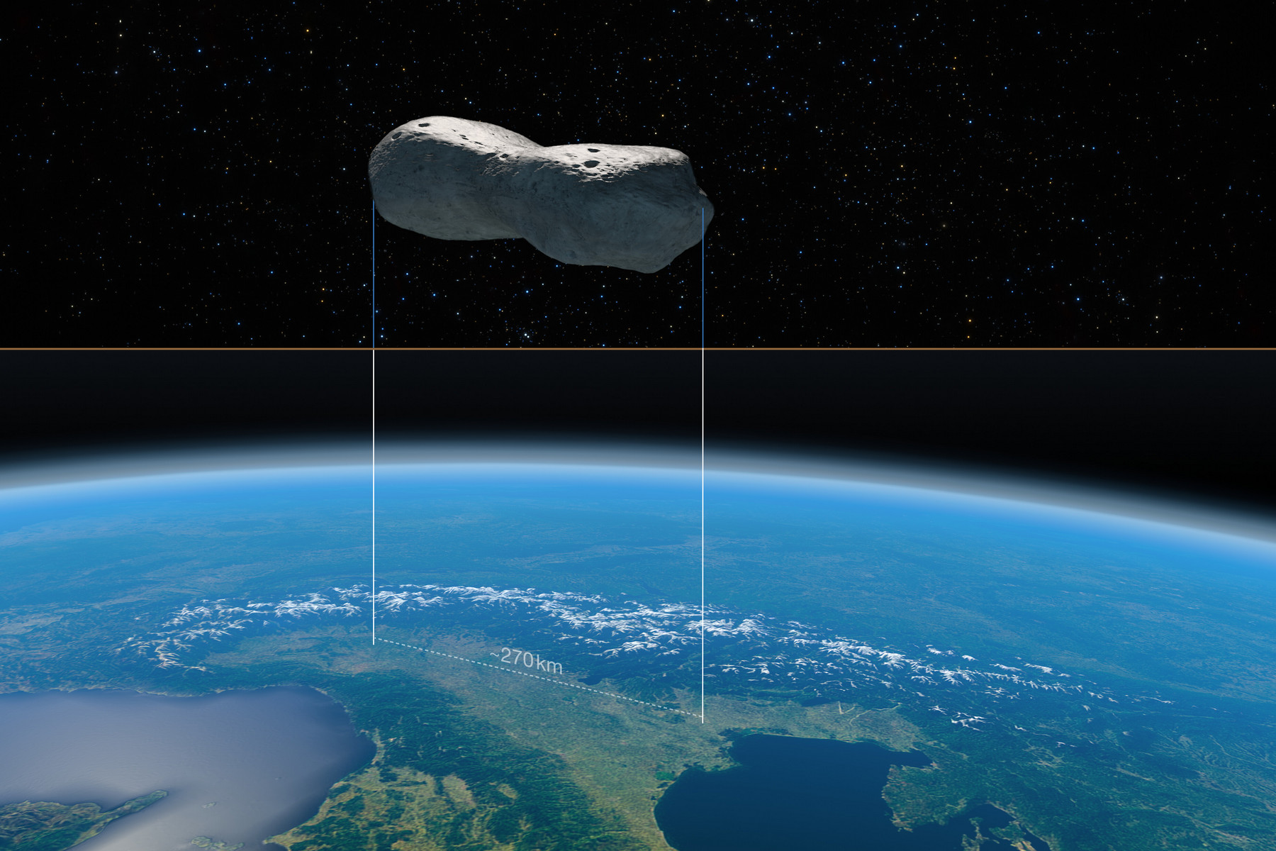 Srovnání velikosti planetky Kleopatra a severní Itálie.