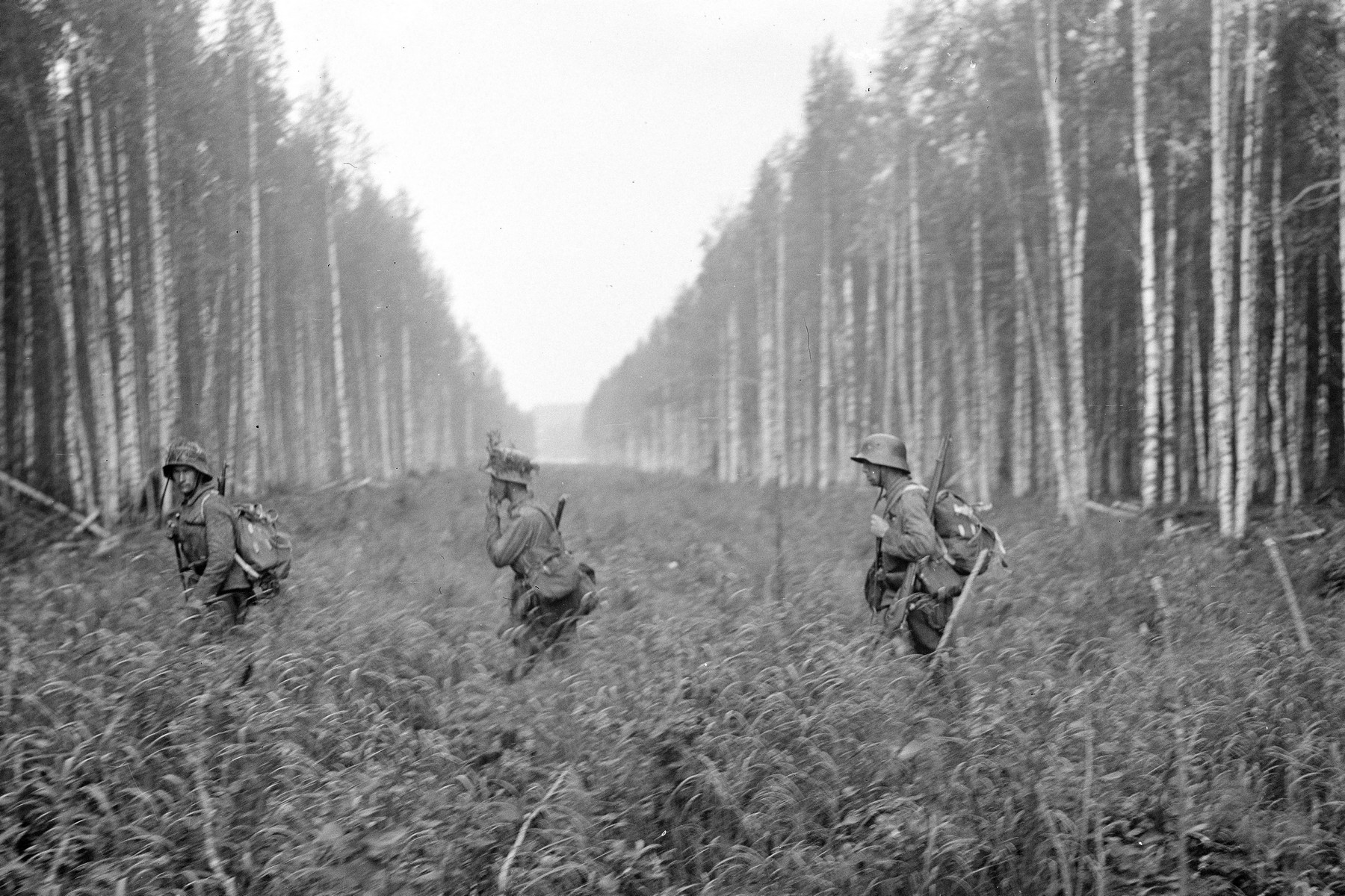 Finští vojáci přeházejí sovětskou hranici poblíž Tohmajärvi v létě 1941. Helsinky deklarovali svoji účast ve válce jako obrannou.